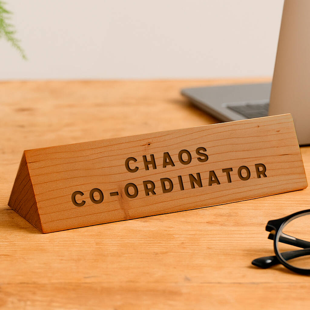 This fun and relatable wooden desk sign is engraved with the slogan “Chaos Co-ordinator”.