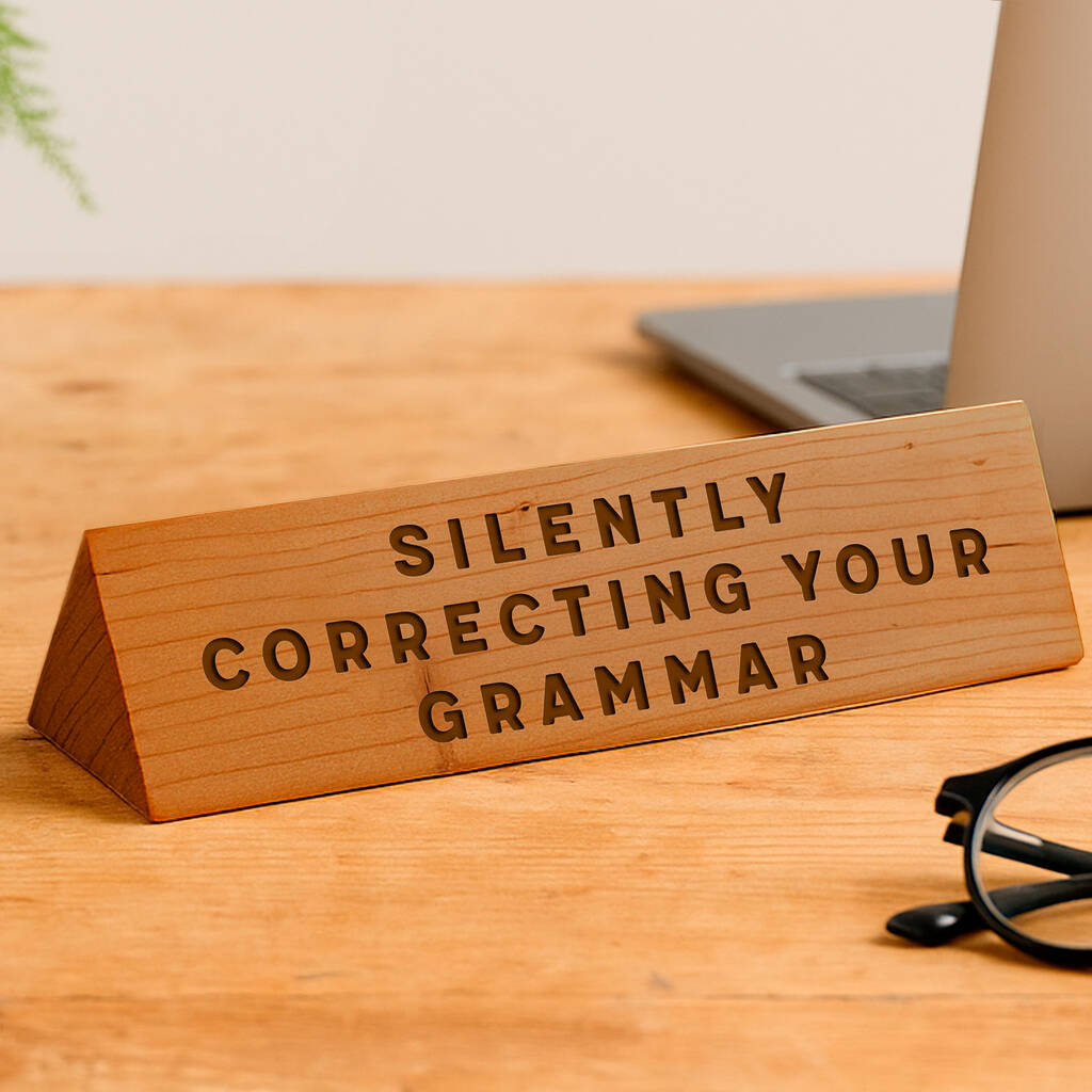 This clever wooden desk sign is engraved with the witty slogan “Silently Correcting Your Grammar”