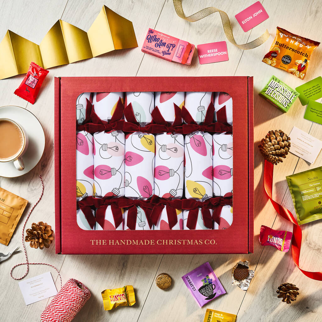 Brighten your festive table with our set of 6 Christmas crackers, featuring a playful, colourful string light design.