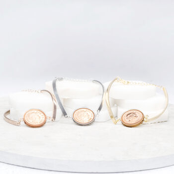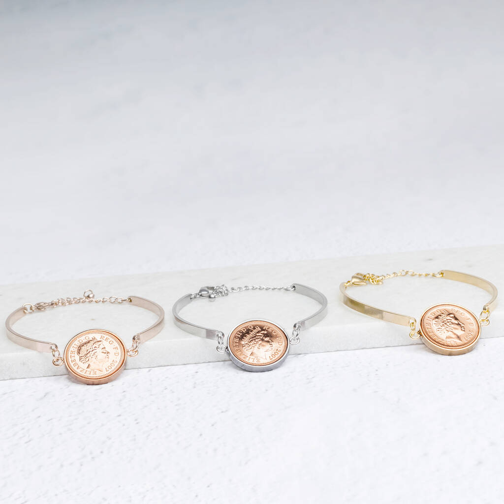 A minimalist 18th birthday one pence bracelet made with a beautifully polished 18th birth date one pence coin.
