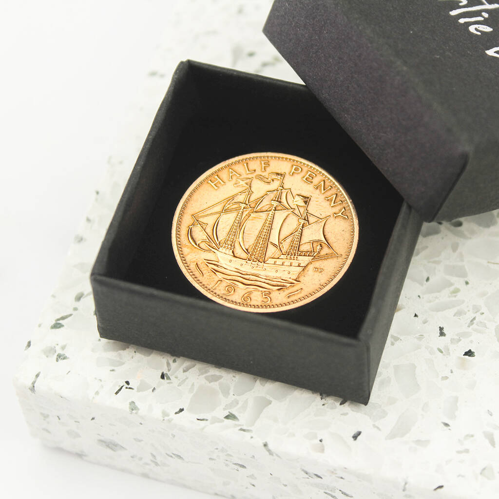 We are also offering a 1965 ship half penny coin that has never been in circulation and comes boxed, see final photo.