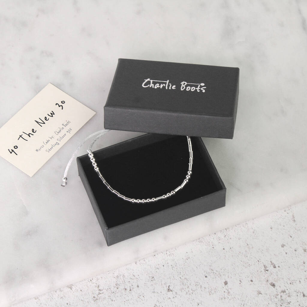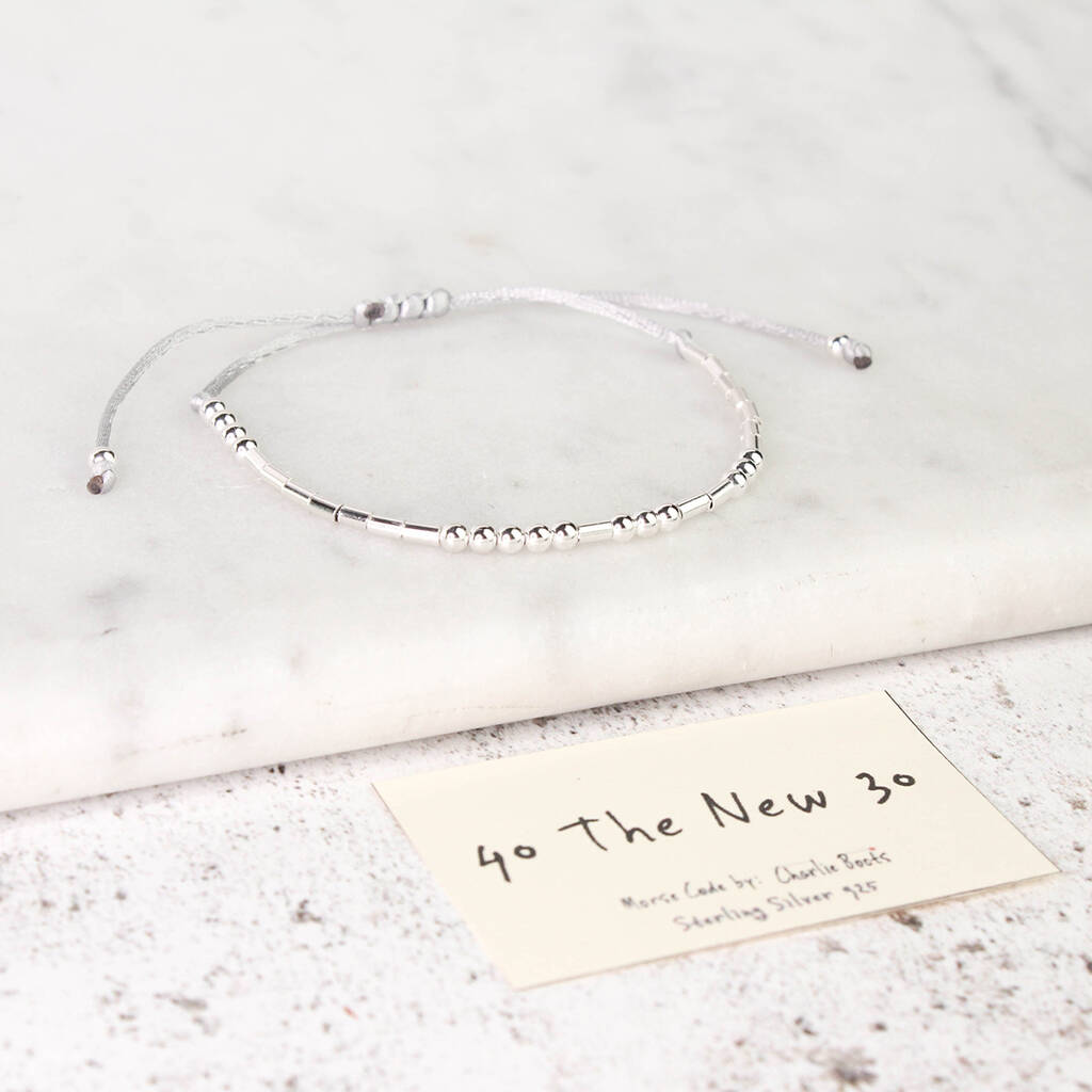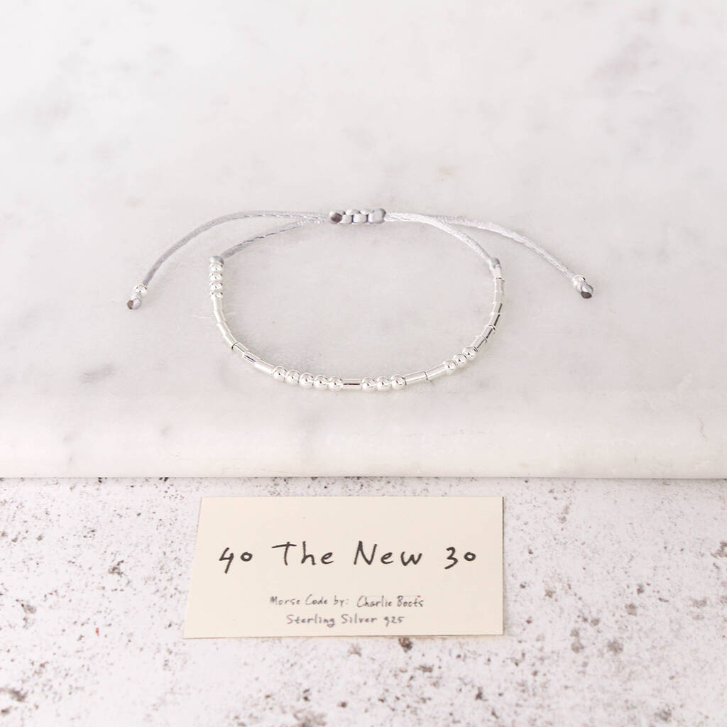 A sterling silver Morse Code bracelet that spells '40 The New 30' in beaded dots and dashes. Perfect as a 40th birthday gift.
