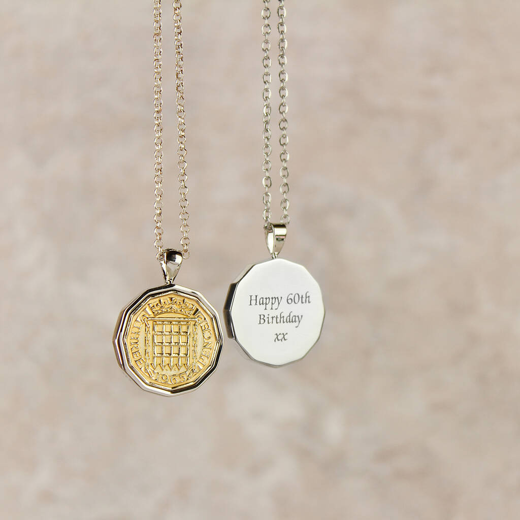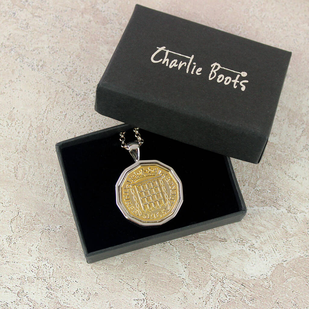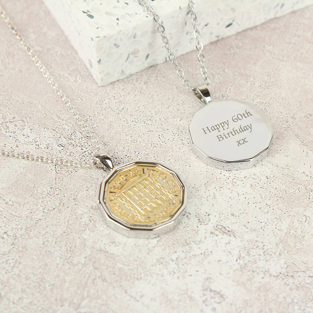 A 1965 threepence coin necklace, ideal for celebrating an 60th birthday. Engraving is also available.