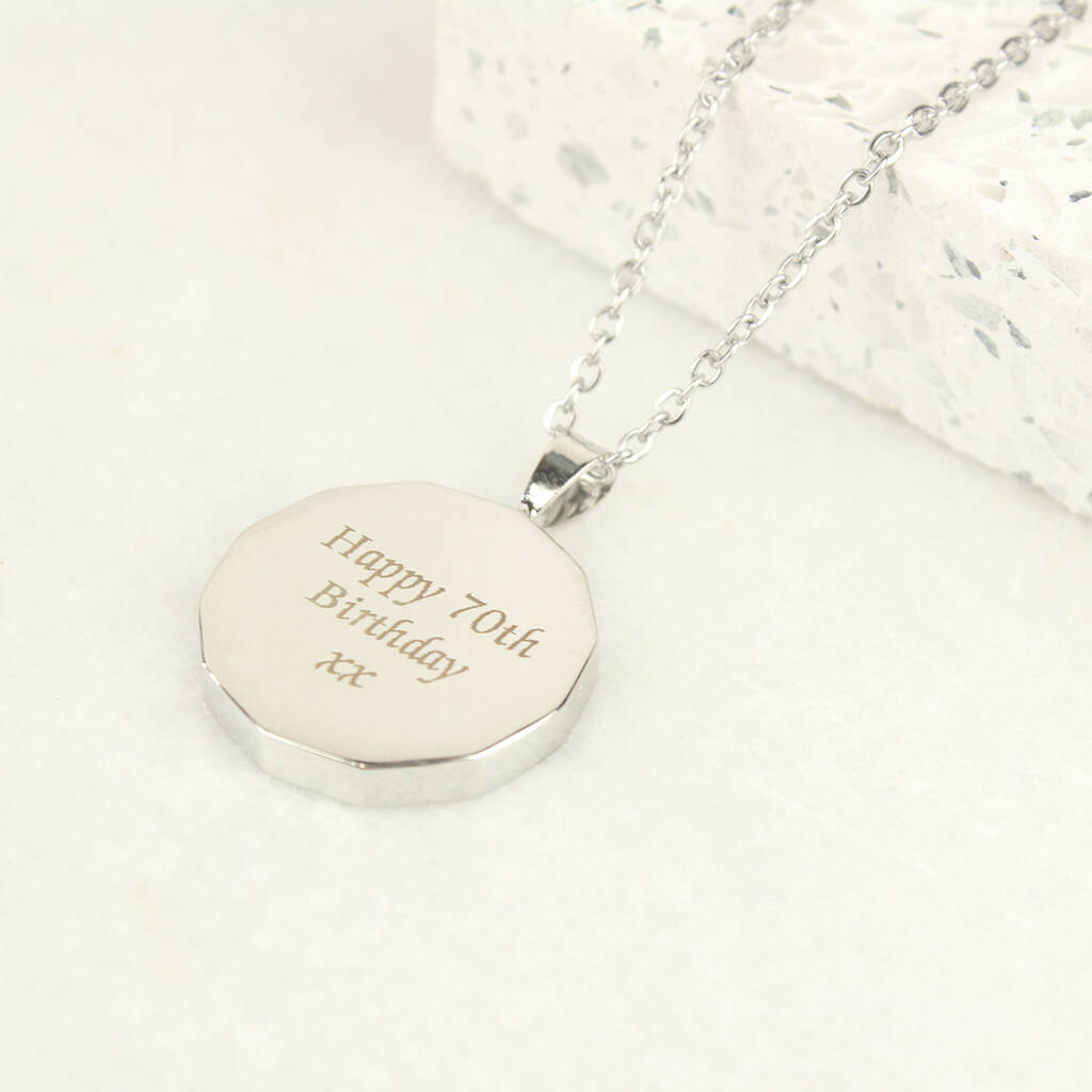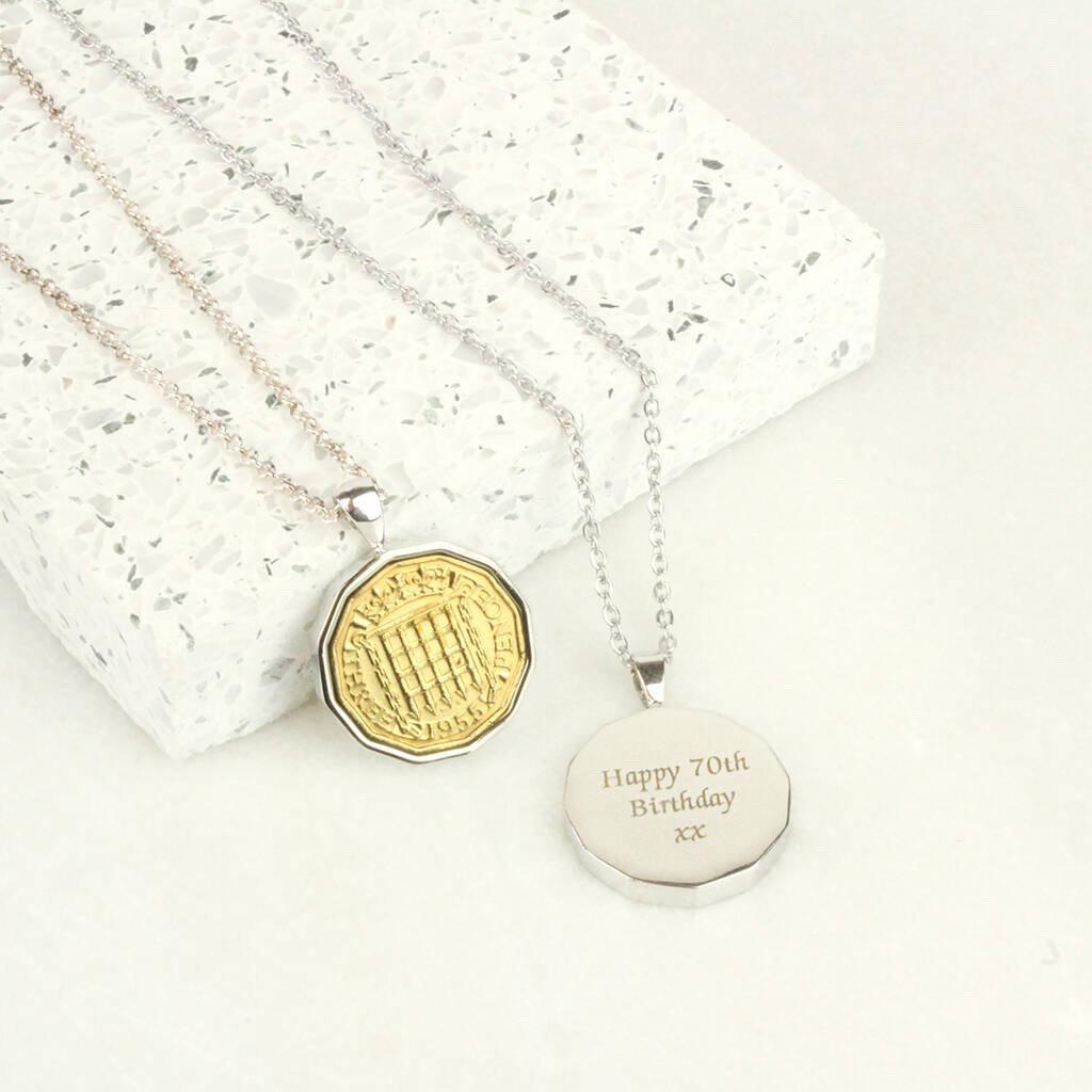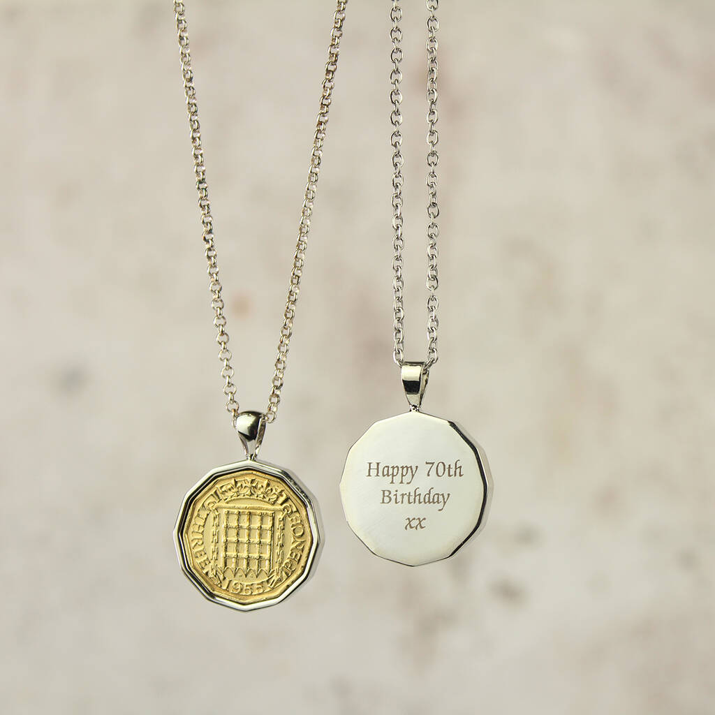 A 1955 threepence coin necklace, ideal for celebrating an 70th birthday. Engraving is also available.