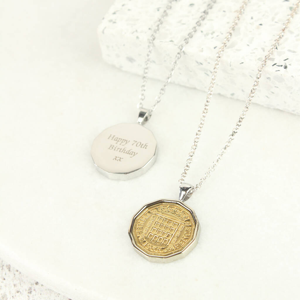 A 1945 threepence coin necklace, ideal for celebrating an 80th birthday. Engraving is also available.
