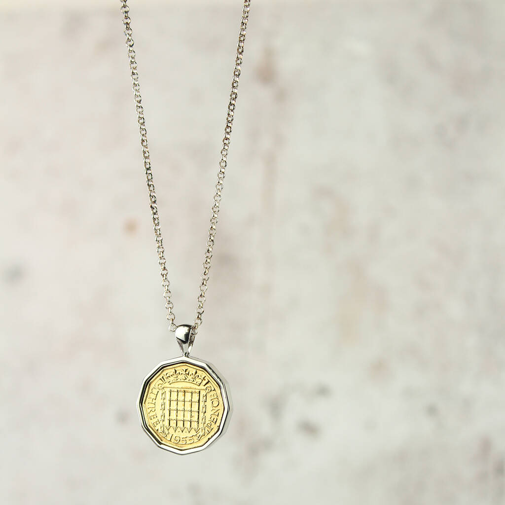The pendant features a genuine threepence coin, polished to a beautiful shine. The gold tone of the coin blends nicely with the silver pendant setting.