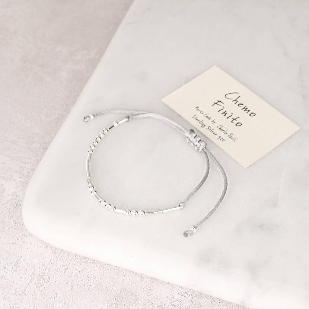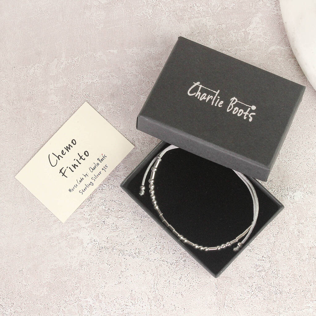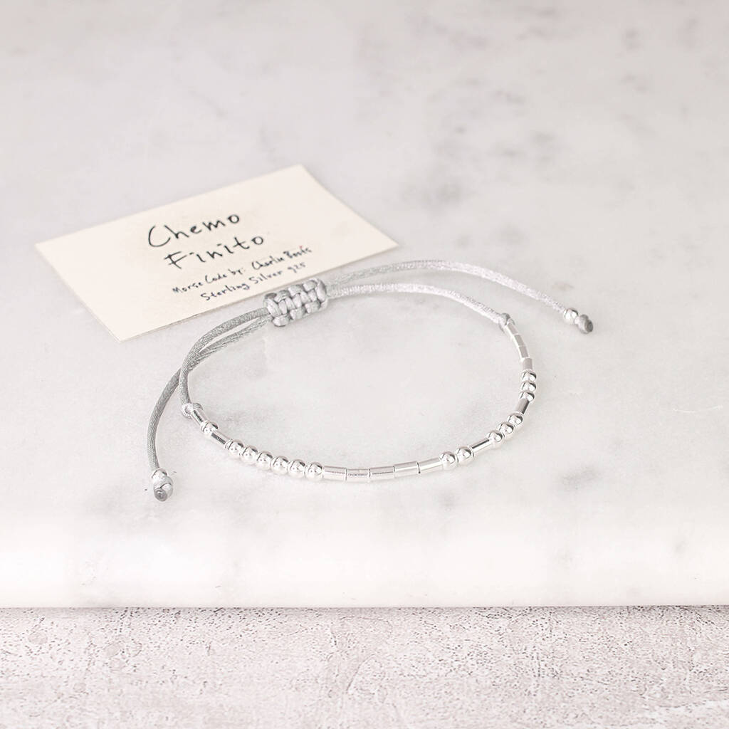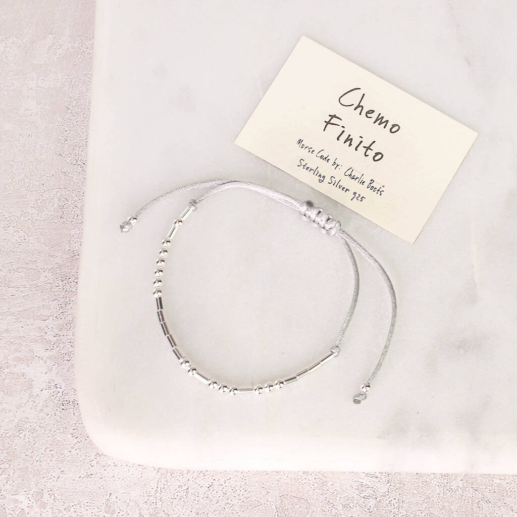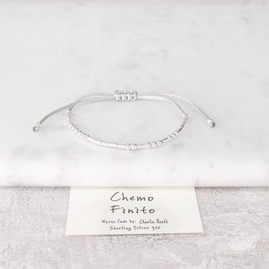 A silver 925 Morse code bracelet that spells 'chemo finito' in beaded dots and dashes. Made to offer cancer support