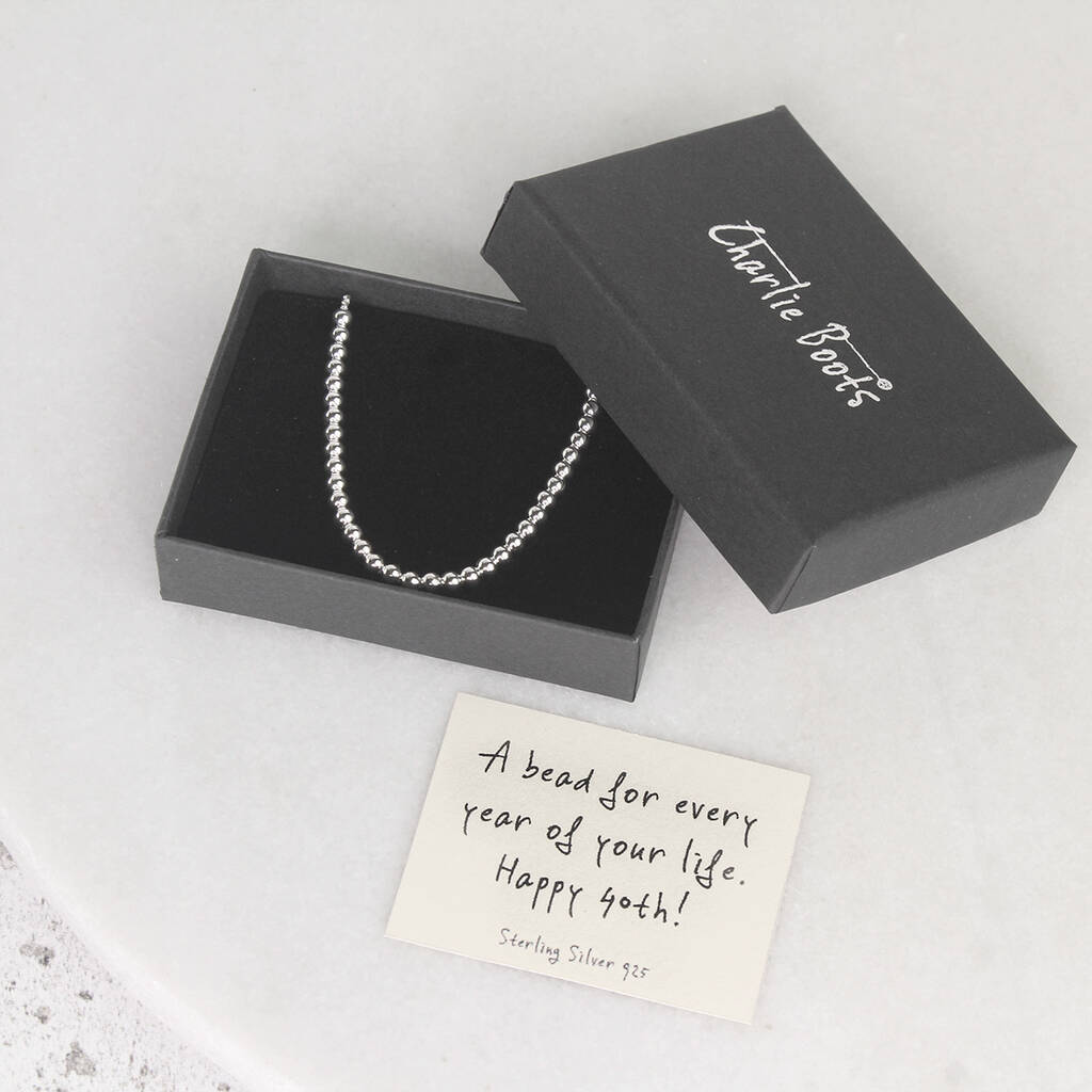 A sterling silver 925 slider bracelet showing 40 beads on a silver chain, each representing a year of life for the 40th birthday.
