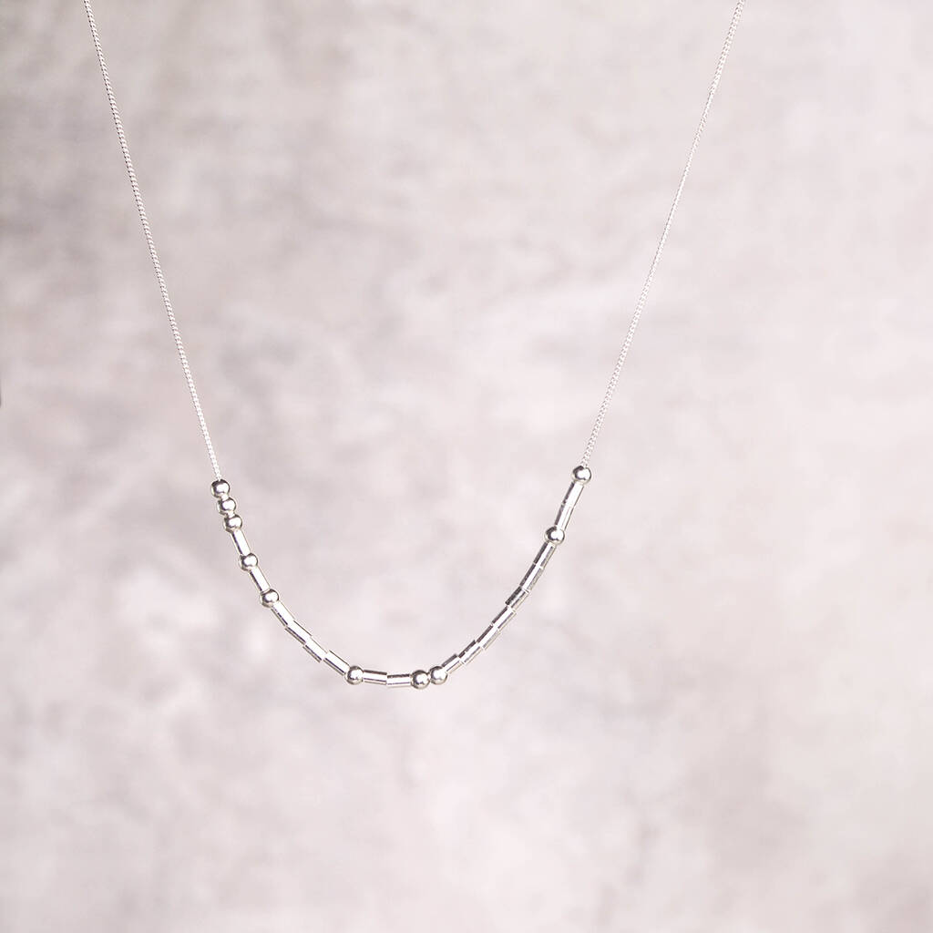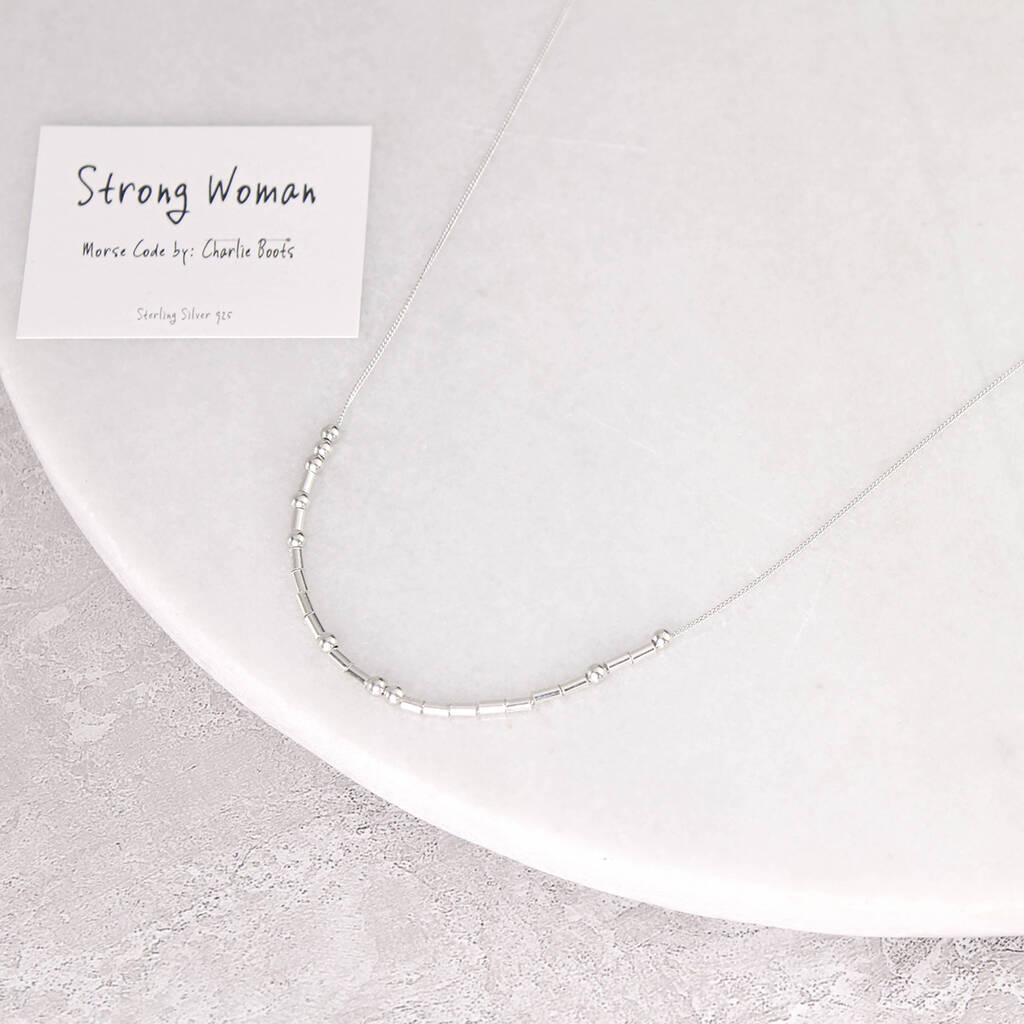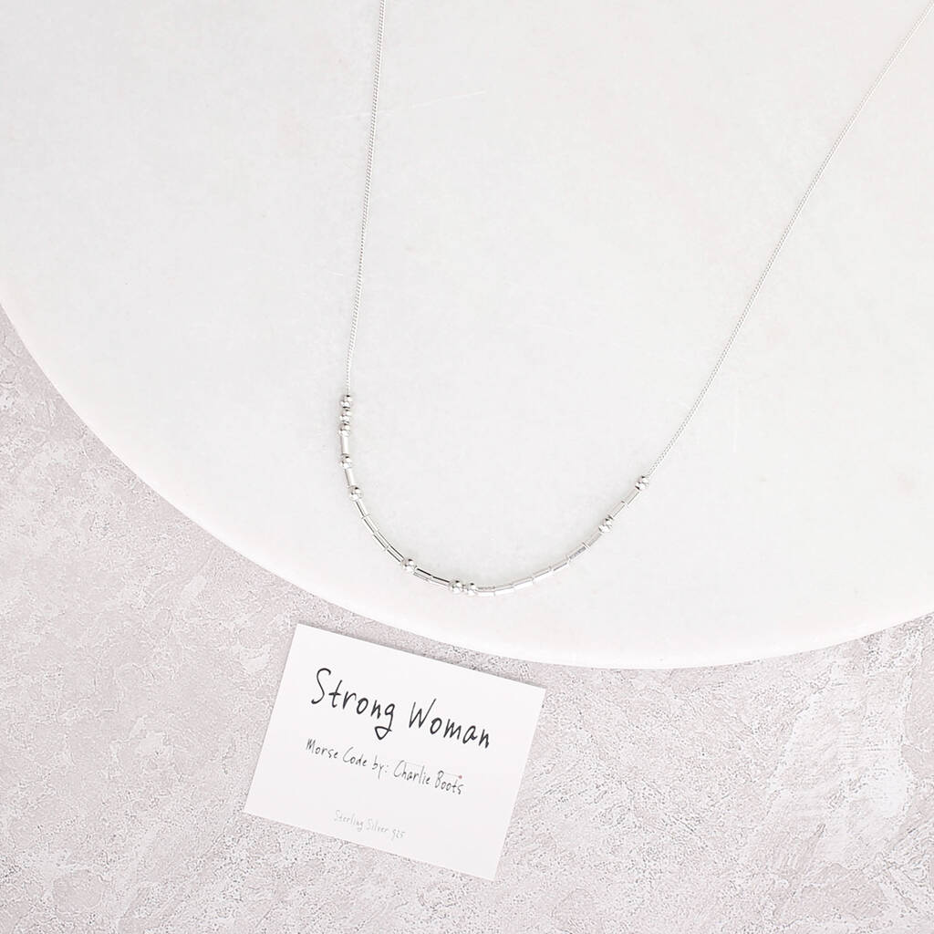 A sterling silver morse code necklace that spells 'strong woman' in beaded Morse code dots and dashes.