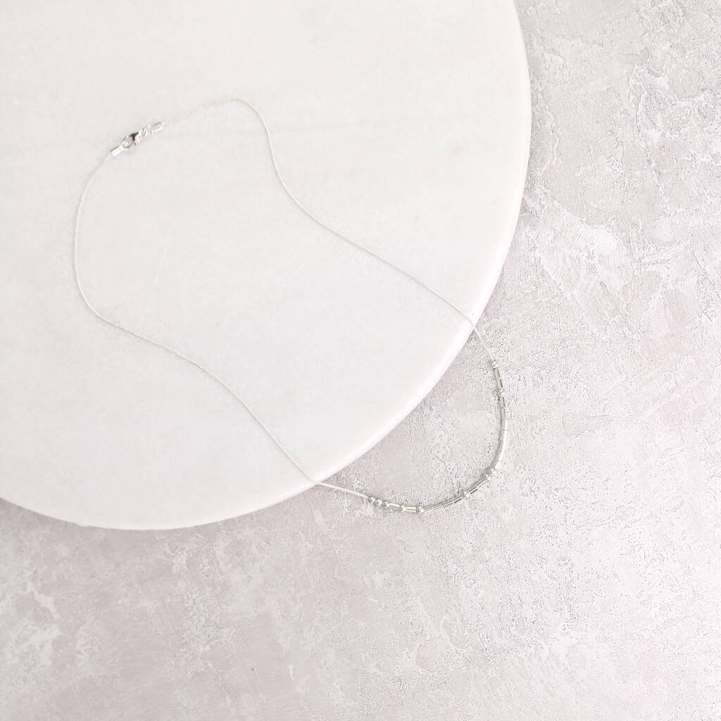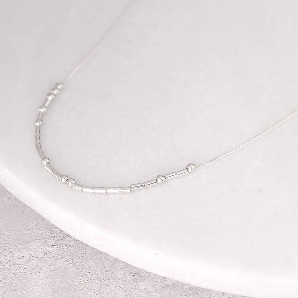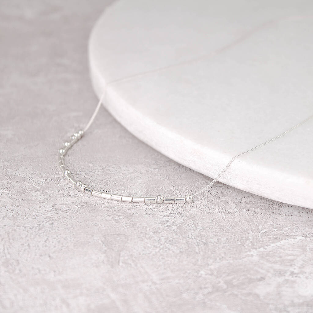 A sterling silver morse code necklace that spells 'strong woman' in beaded Morse code dots and dashes.
