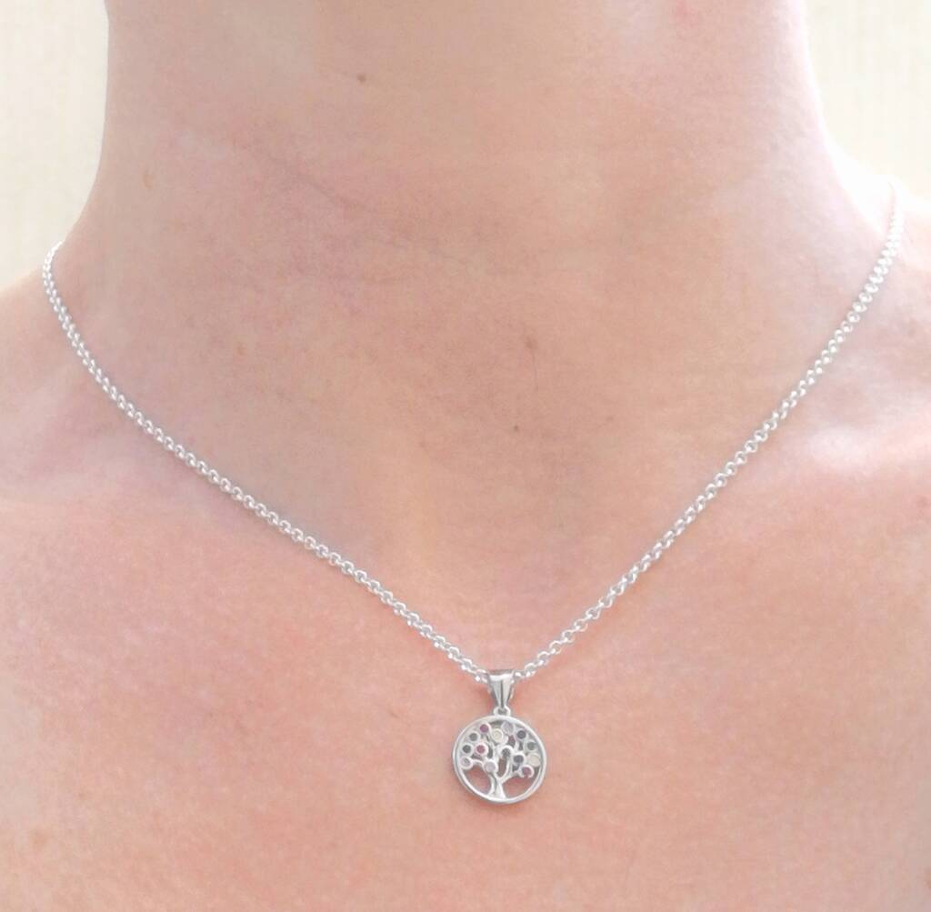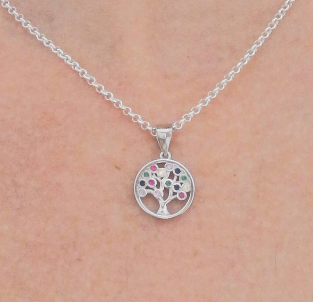 The necklace features a 925 sterling silver round pendant with a tree design, decorated with vibrant, multicoloured zirconia stones.