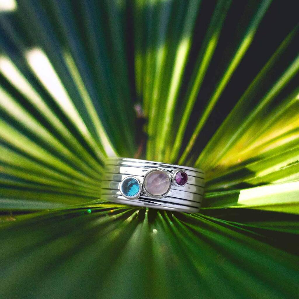Our Ibiza Sunset spinning ring will transport you to the beautiful Mediterranean coast. This handmade swiss blue topaz and rose quartz spin ring accented with rhodolite garnet embodies the beauty of the Balearic sunset. This beautiful silver spin ring is an ideal gift for those with November or January birthdays.
