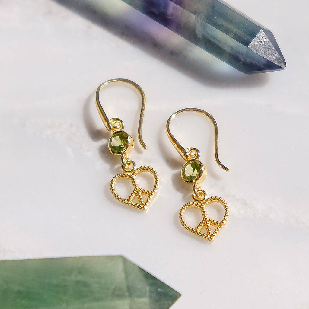 Bring peace and love to your ethical jewellery edit with our Peace Heart Peridot Drop Earrings. Responsibly handmade using eco-friendly materials, these gemstone drop earrings feature the iconic peace symbol in a heart-shaped design. Genuine green gemstone, peridot, the August birthstone, completes the look.