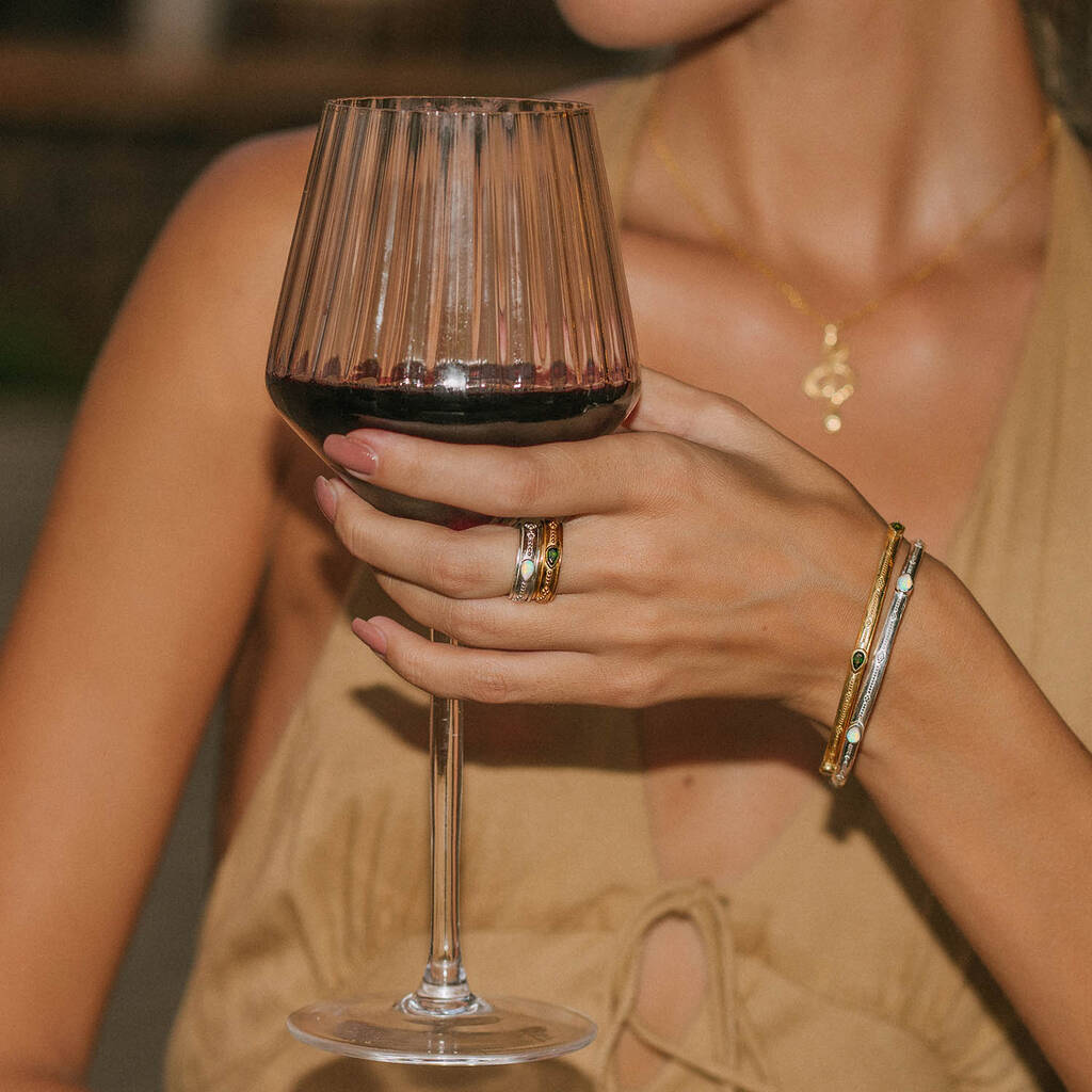 Crafted in sterling silver, this spinning ring channels Saraswati’s spirit of wisdom and artistry. The Opal gemstone inspires creativity and emotional connection, while the Tibetan prayer wheel–inspired band soothes the mind. Finished with intricate rawa detailing for a touch of tradition.