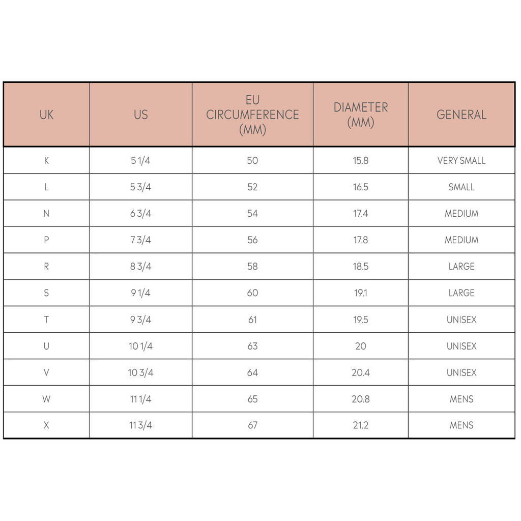 Should you not find the ring size you need, we offer a bespoke custom service, as well as a printable ring size guide which can be emailed to you on request. Contact us for more details to ensure the perfect fit each and every time.