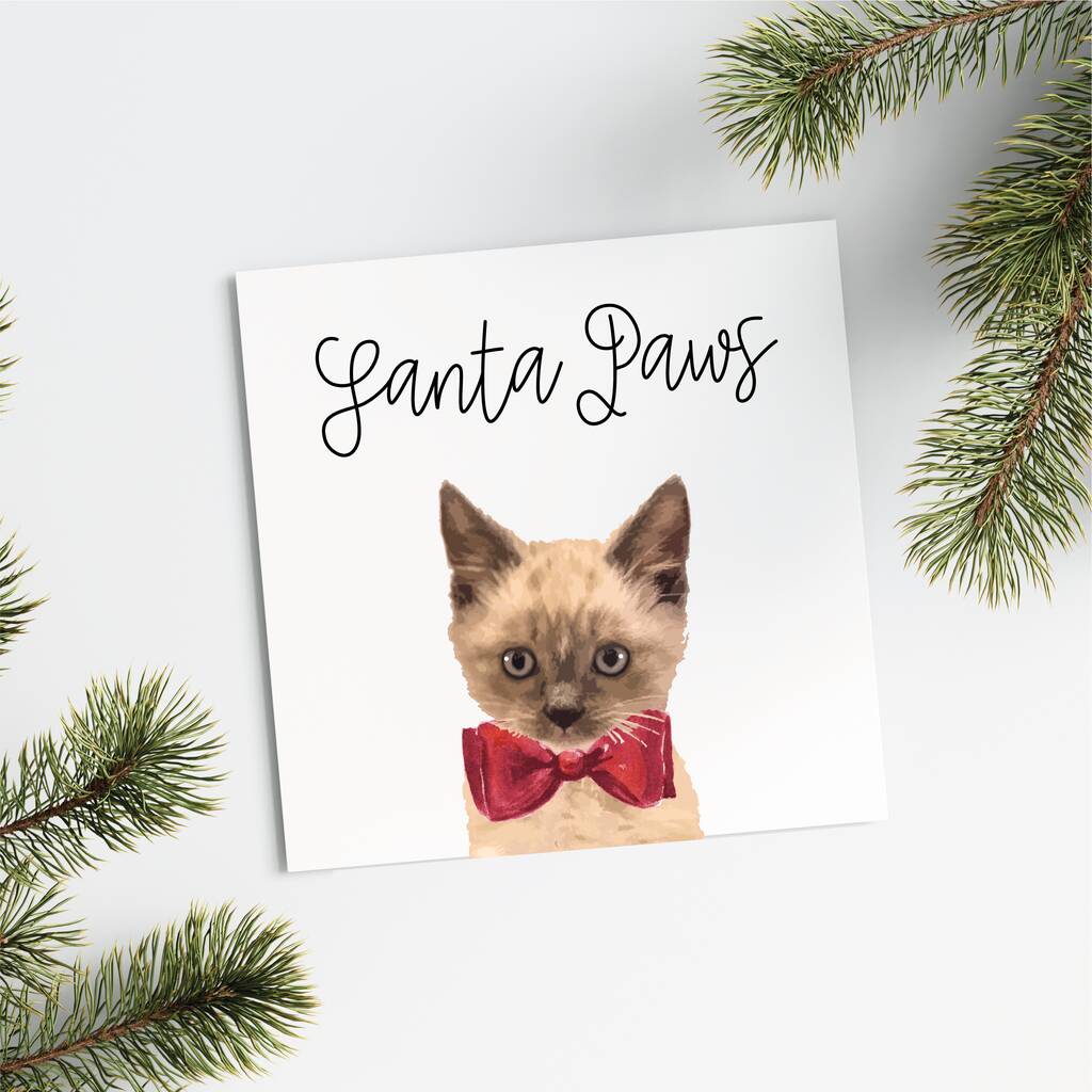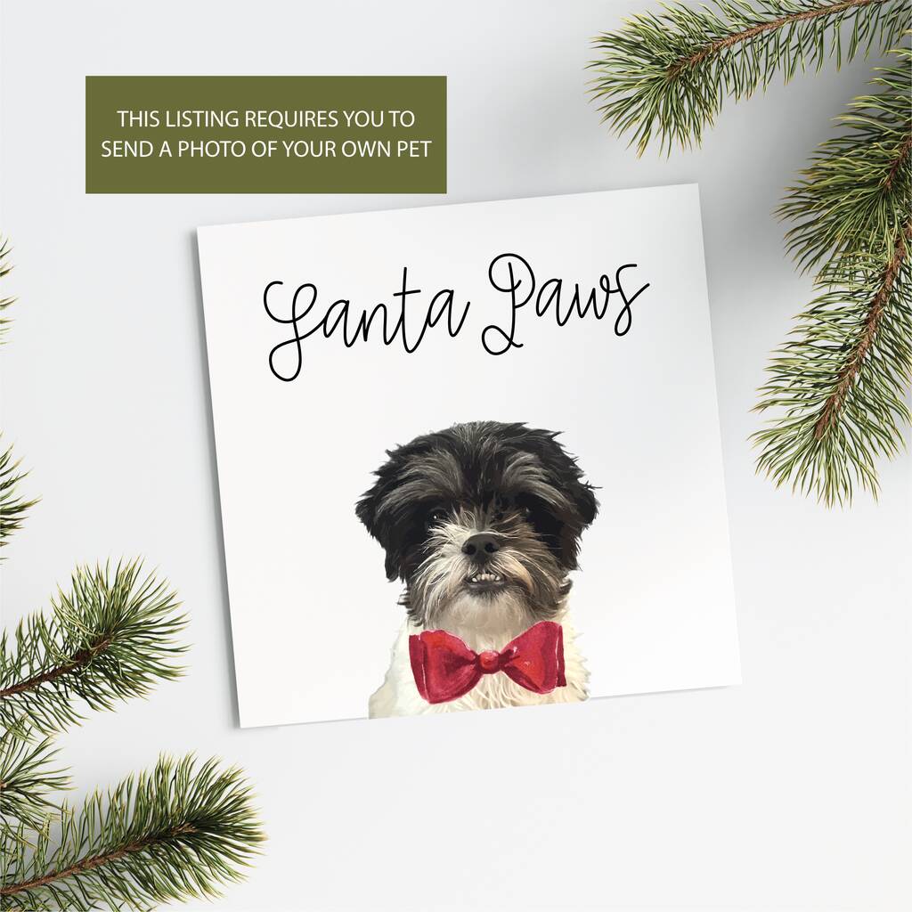 Change your favourite photo into a Christmas card. We edit your own photo of your pet, into an illustration style image and add a red Christmas bow. Finish off your card with a personalised message printed in black ink on the front. Size square 148mm x 148mm. Printed onto luxury white card and paired with a white envelope.