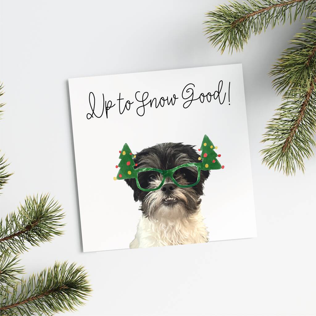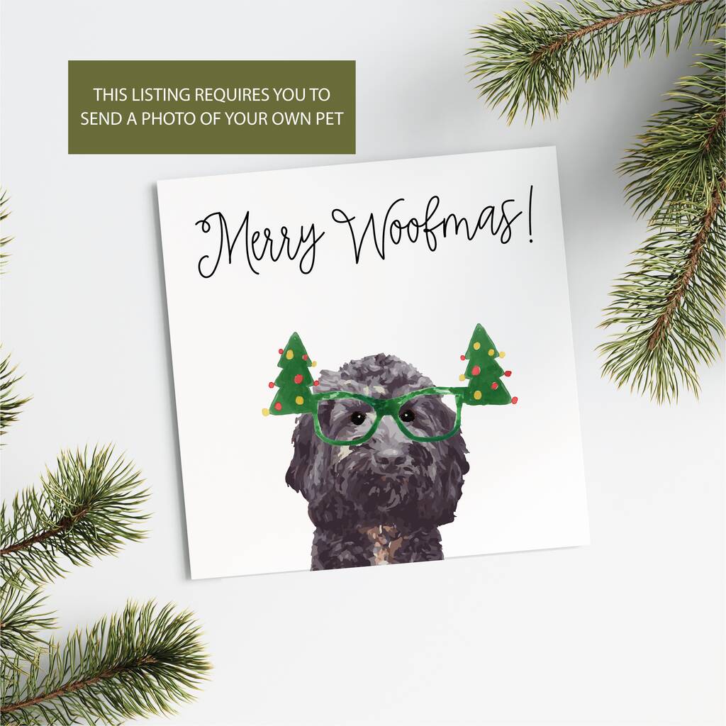 A cute and fun Christmas card featuring your pet wearing some novelty Christmas tree glasses!