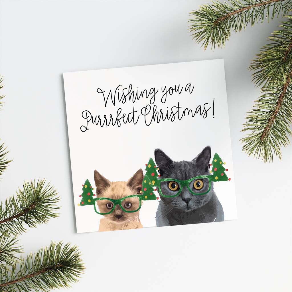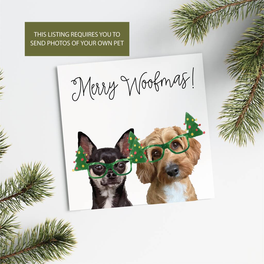 A cute and fun Christmas card featuring your pets wearing some novelty Christmas tree glasses!