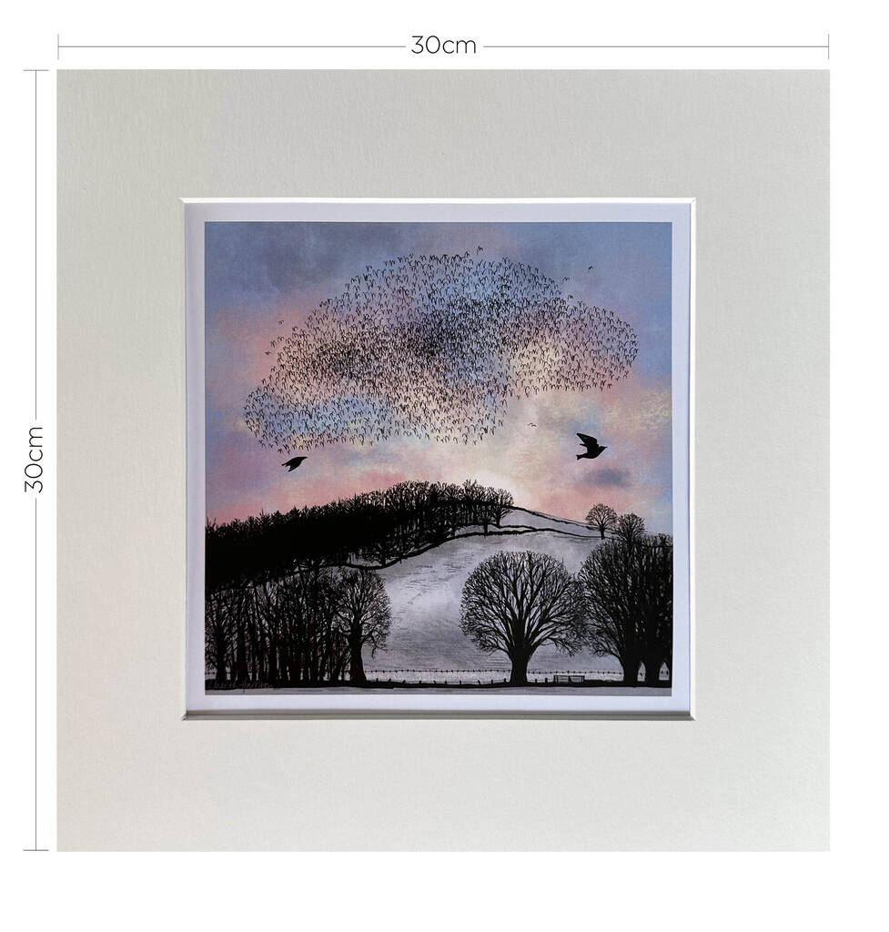 This stunning artwork features a murmuration of starlings silhouetted against a bright pink and orange sunrise sky. Sitting on the horizon are snow-topped hills, lending an air of tranquillity to the scene. Its bright and pleasant design makes the print a suitable gift for all occasions, from birthdays to anniversaries and Valentine’s Day.