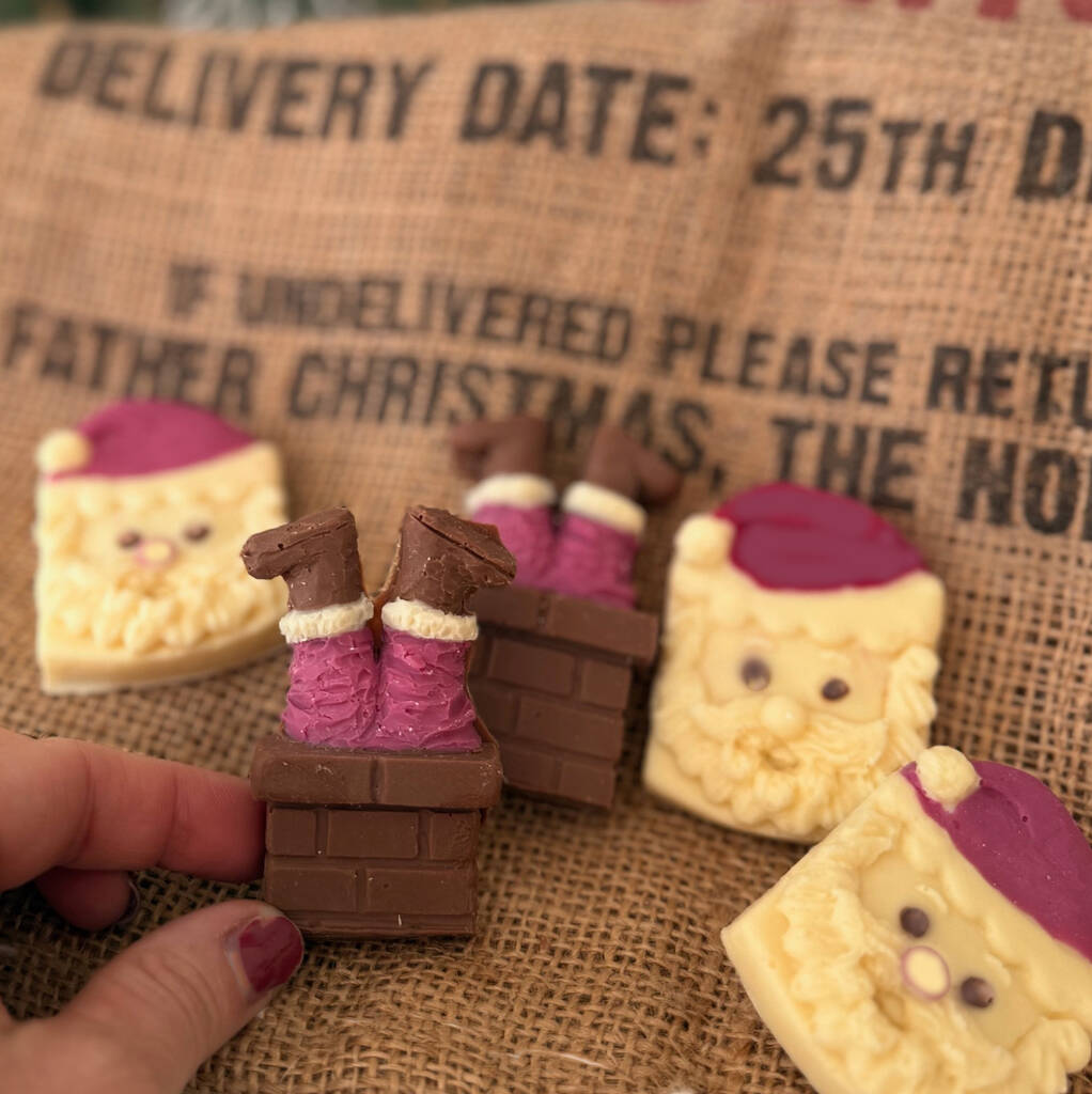 - Box contains five solid chocolate Santas