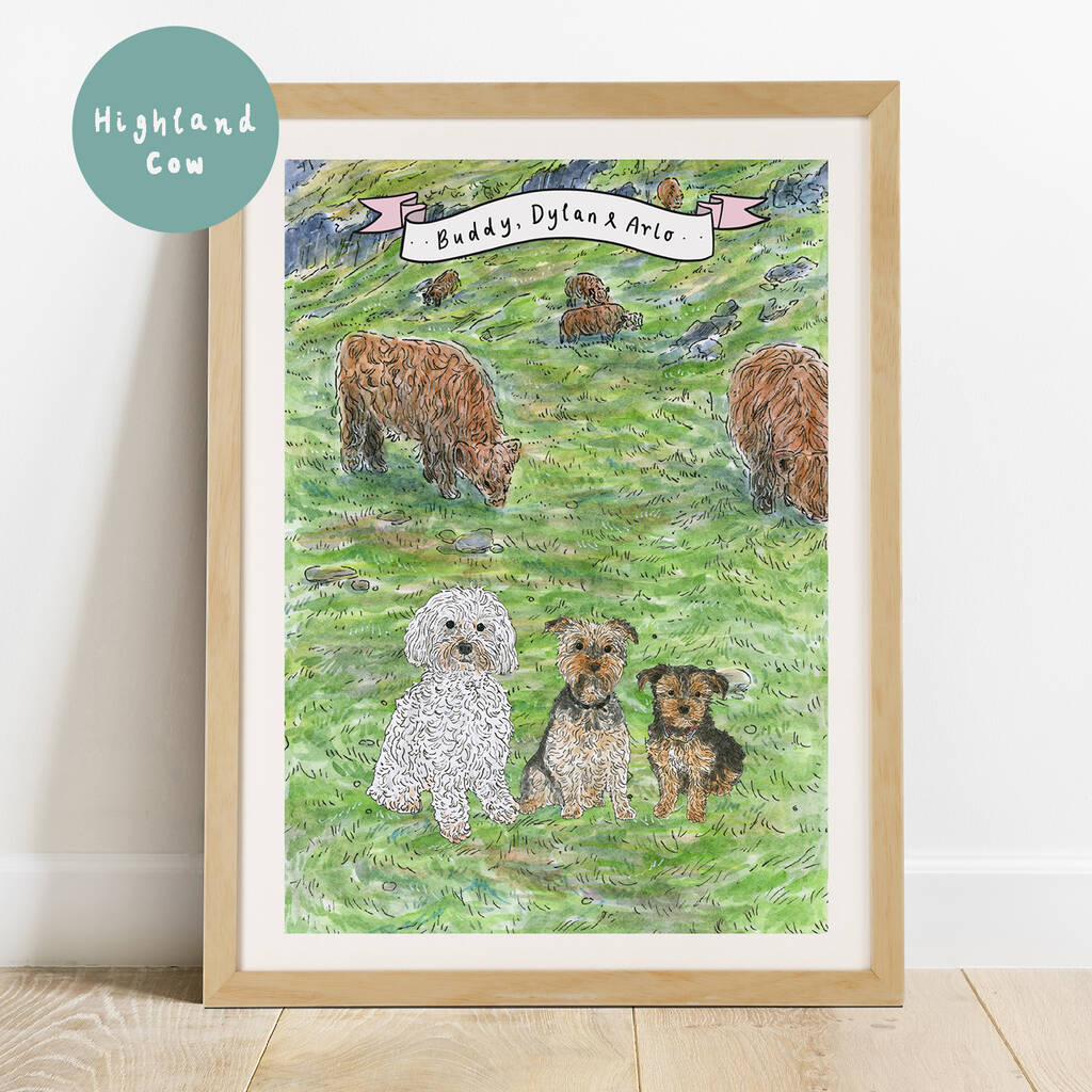 1. Select from the available background scenes: beach, lakeside, garden, cliffside, and highland cow. These scenes have been carefully hand-painted in watercolors and are ready to be digitally combined with your custom pet illustration to create a print.