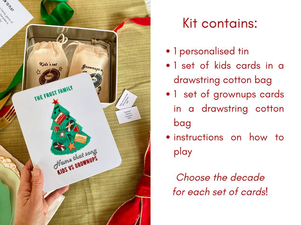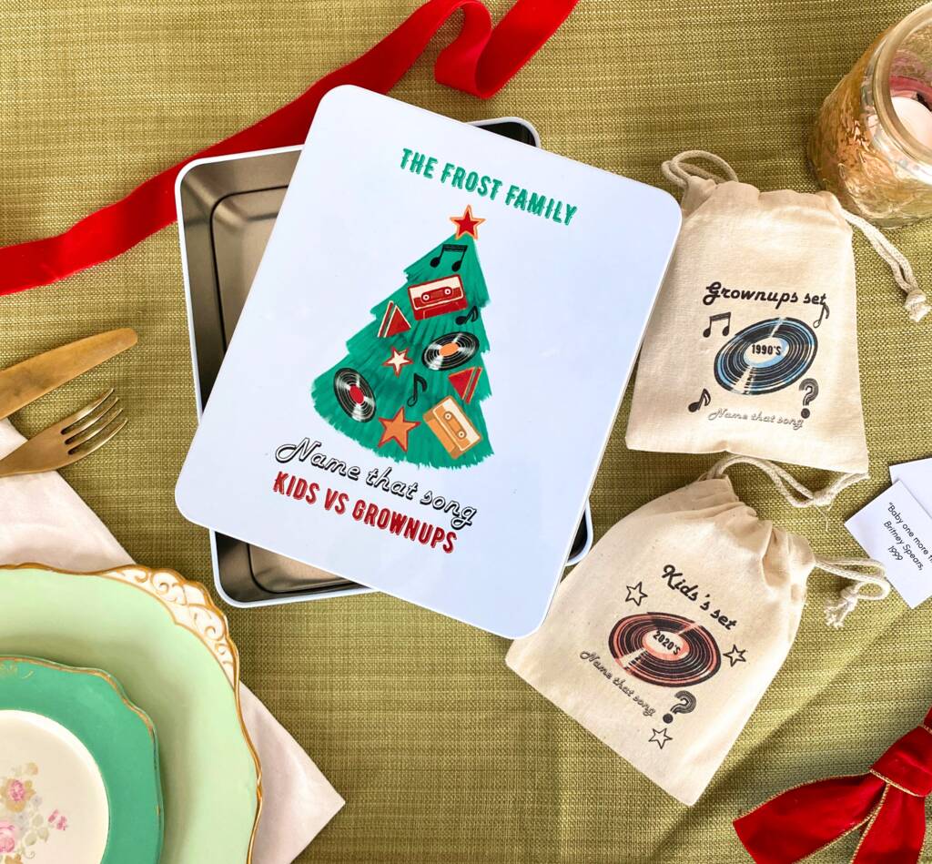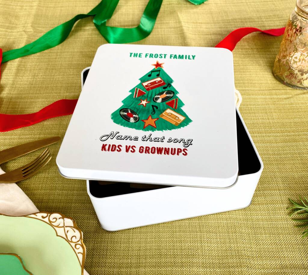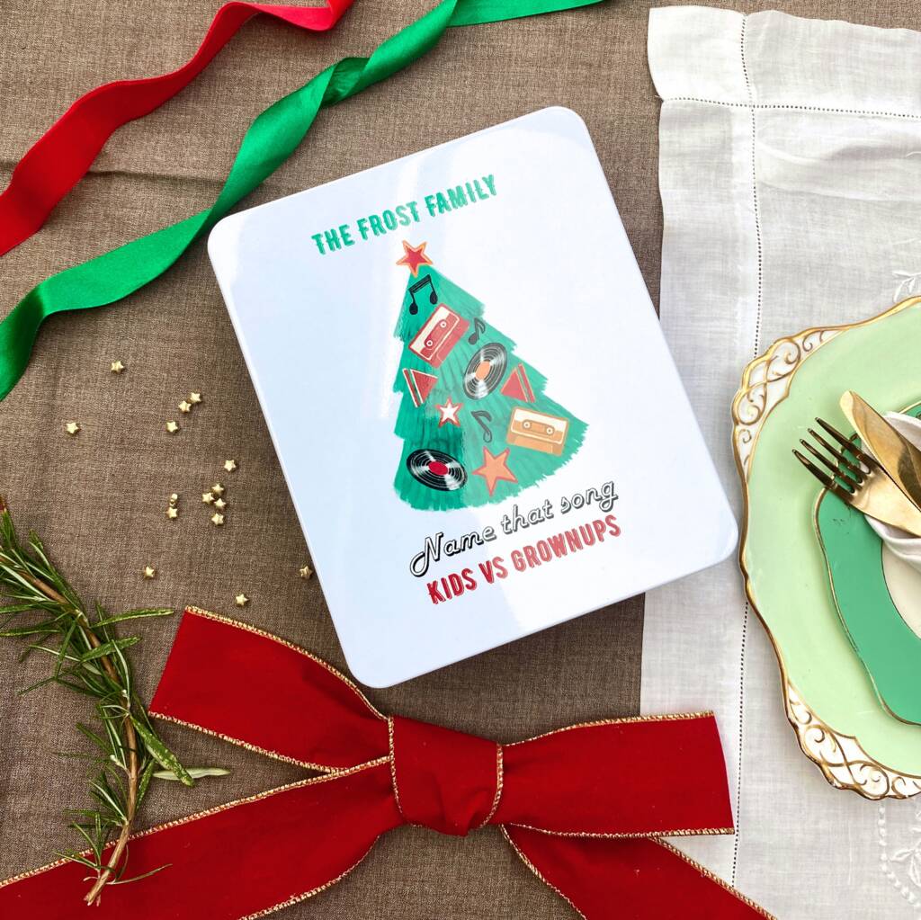 This fun Christmas musical charades game comes with two sets of customised questions to suit your family, packed into a personalised tin featuring your surname