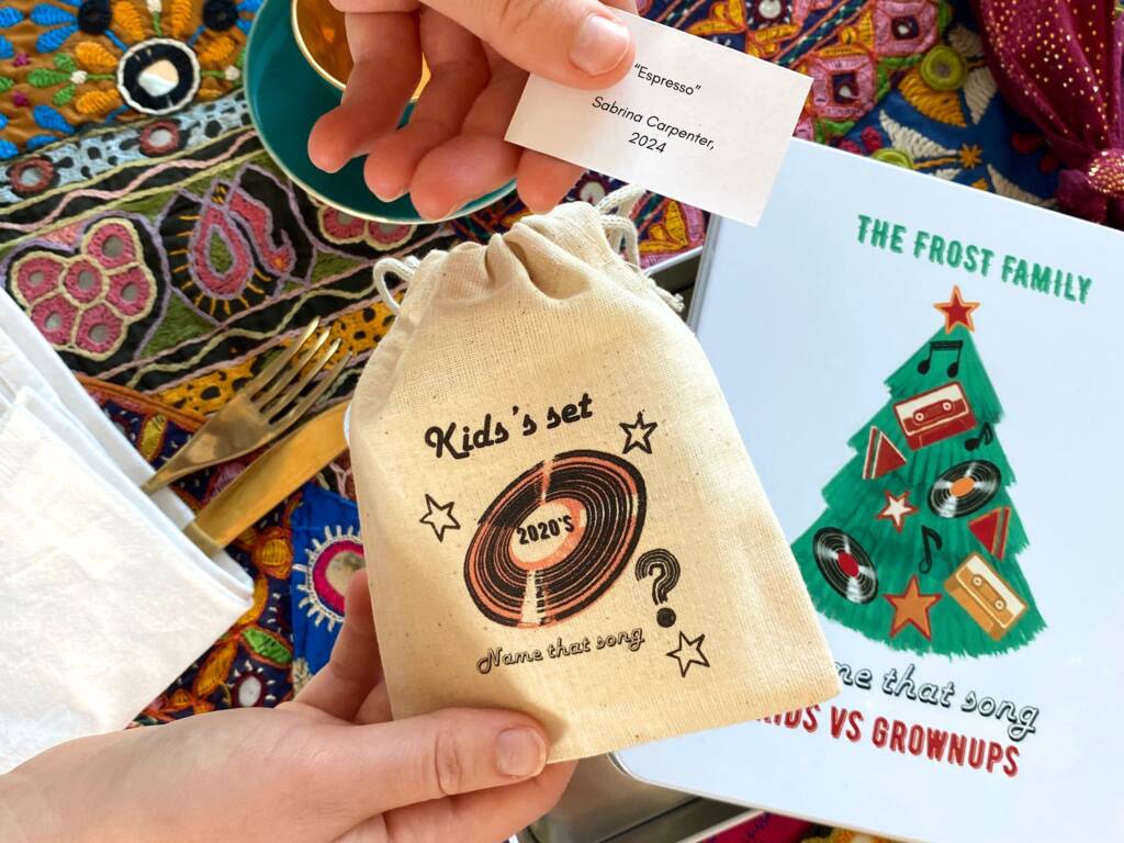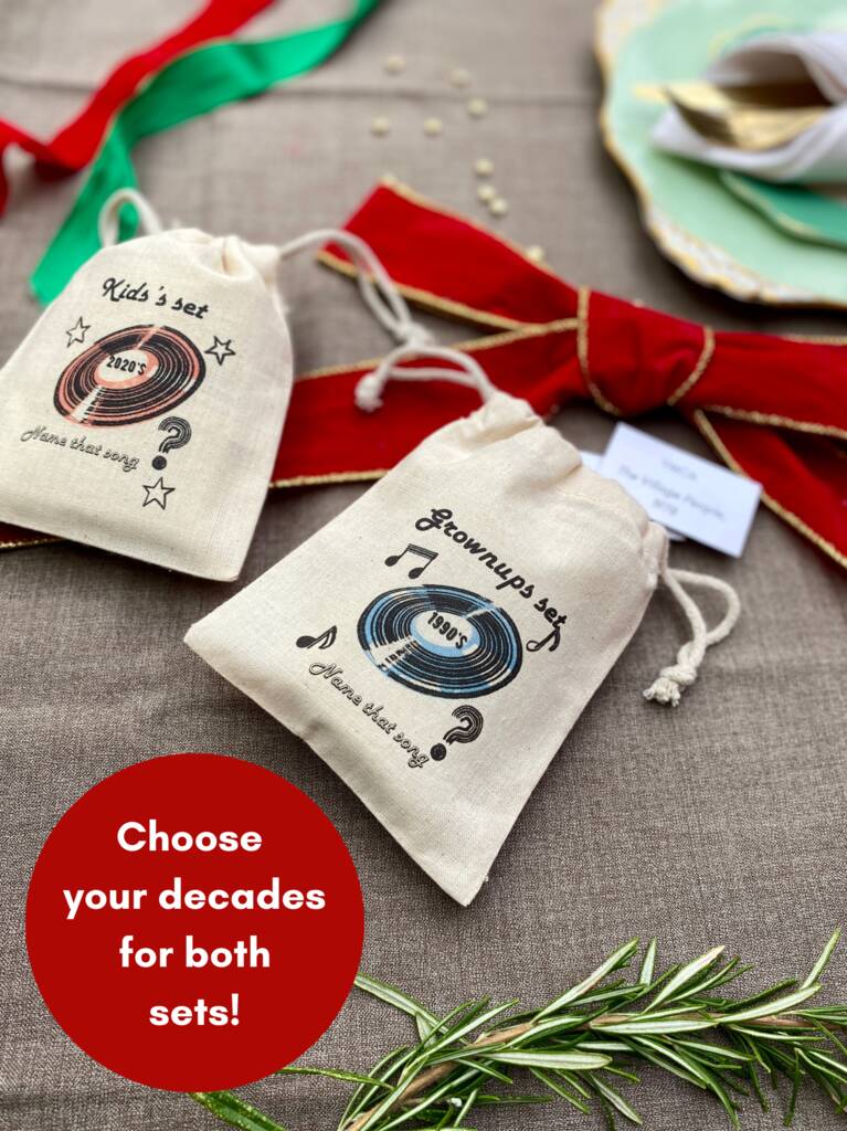 The tin is decorated with a retro illustration of a Christmas tree hung with vinyl records and cassette tapes, alongside music streaming play buttons, stars and music notes. The colour scheme is green, red, mustard and black, with a midcentury feel. Each drawstring cotton canvas bag has a picture of a vinyl record on, along with the words "kids set" or "grownups set", and the decade you've chosen.