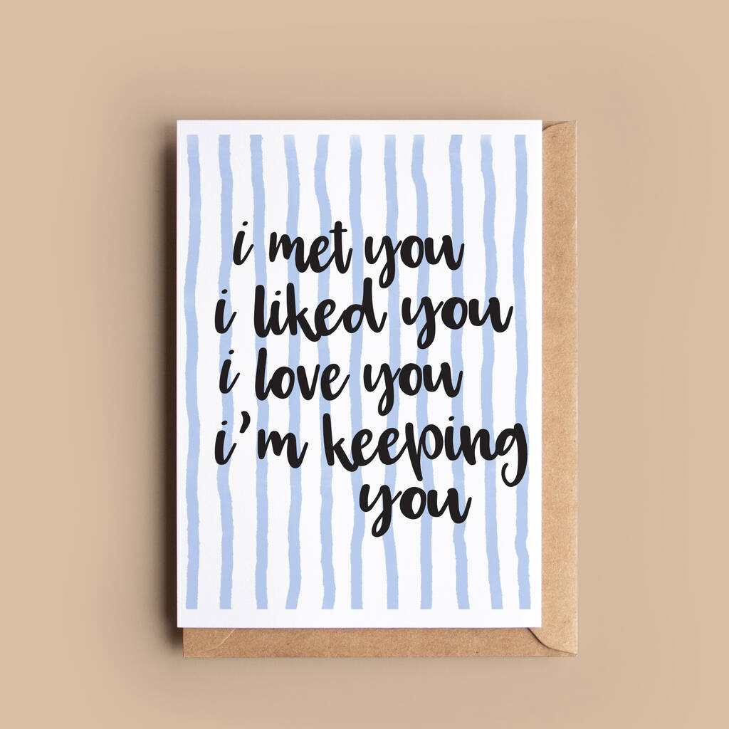 Celebrate love with our charming greeting card featuring the heartfelt message: "I Met You, I Liked You, I Love You, I'm Keeping You."