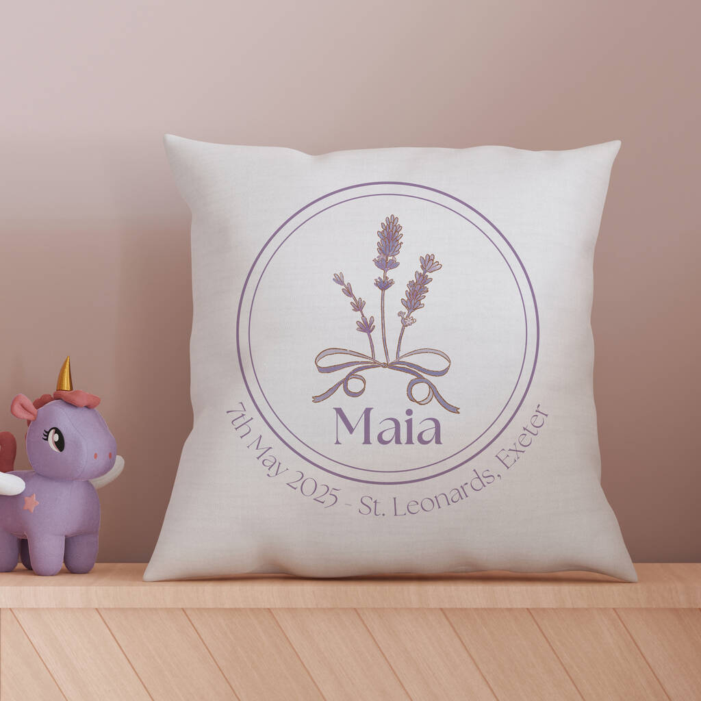 This exquisite cushion features a delicate lavender motif that evokes a sense of calm and tranquility, perfect for creating a serene atmosphere in the baby’s bedroom. What makes this cushion truly special is the opportunity to personalise it. Add the baby's name alongside a significant date and place, transforming this lovely cushion into a cherished keepsake that celebrates their unique journey. Imagine the joy of seeing their name beautifully displayed, making this cushion a sweet focal point in their nursery.
