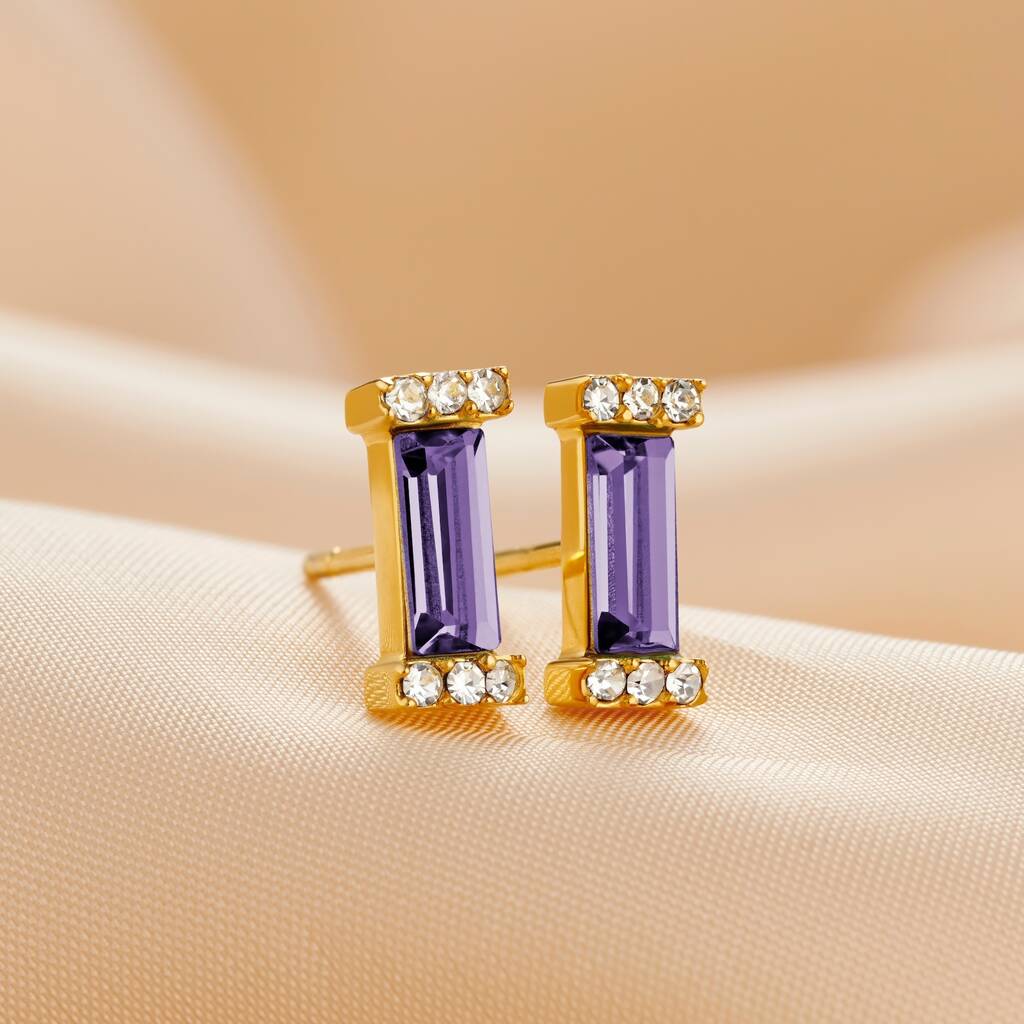 Birthstone stud earrings featuring a baguette cut Swarovski crystal in the coloured crystal birthstone of your choice.
