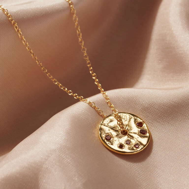 A beautiful spinner disc pendant by Claudette Worters, cast in sterling silver with an organic molten texture, plated in 2.5 microns of 18 carat gold. The pendant is set with clusters of real faceted sparkling semi precious birthstones to represent each month of the year and rotates when spun on its trace chain. - It makes a pretty adult fidget spinner necklace too.