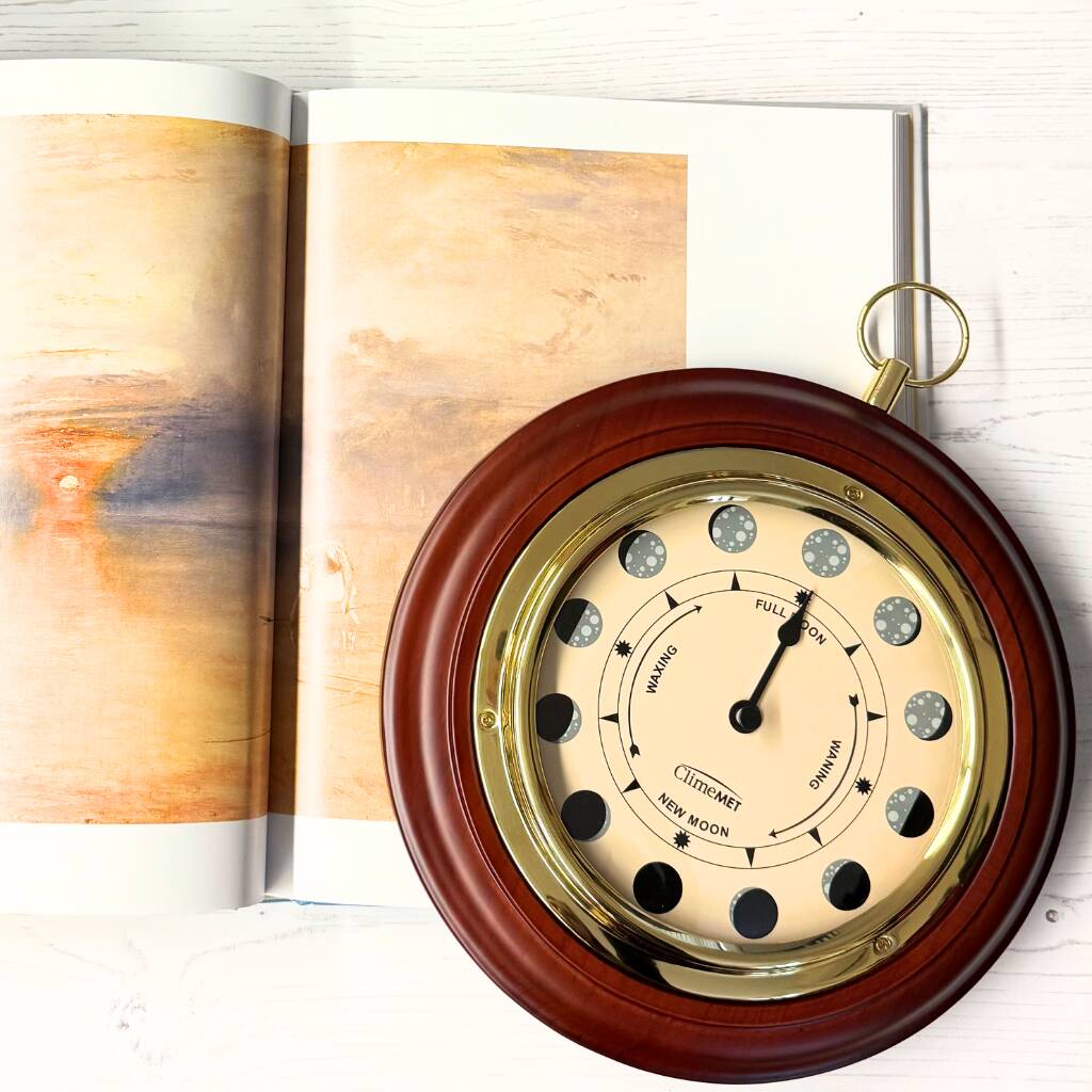 Beautifully designed and precision crafted, the ClimeMET Moon Phase Clock rotates once every 29.5 days, displaying the changing phases of the moon as they unfold. While the exact lunar cycle lasts 29 days, 12 hours, and 44 minutes, the dial is designed for simplicity and elegance. For optimal accuracy, we recommend resetting the clock during a full moon.