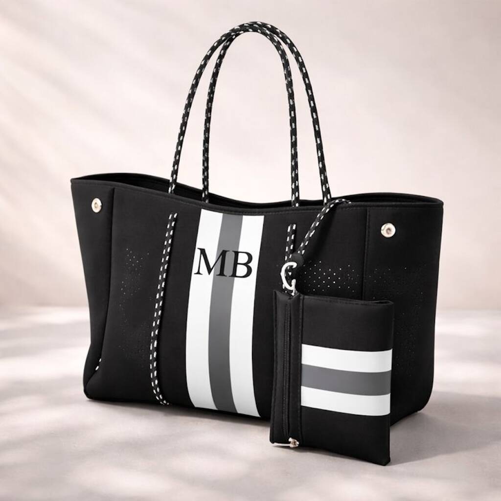 Personalised Black And Grey Stripe Neoprene Tote Bag And Pouch