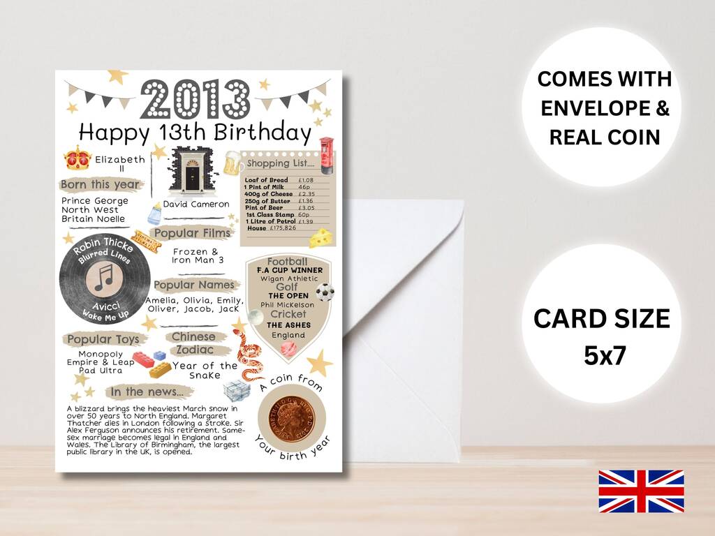 13th Birthday Card With 2013 Coin And Envelope Choose Your Colour