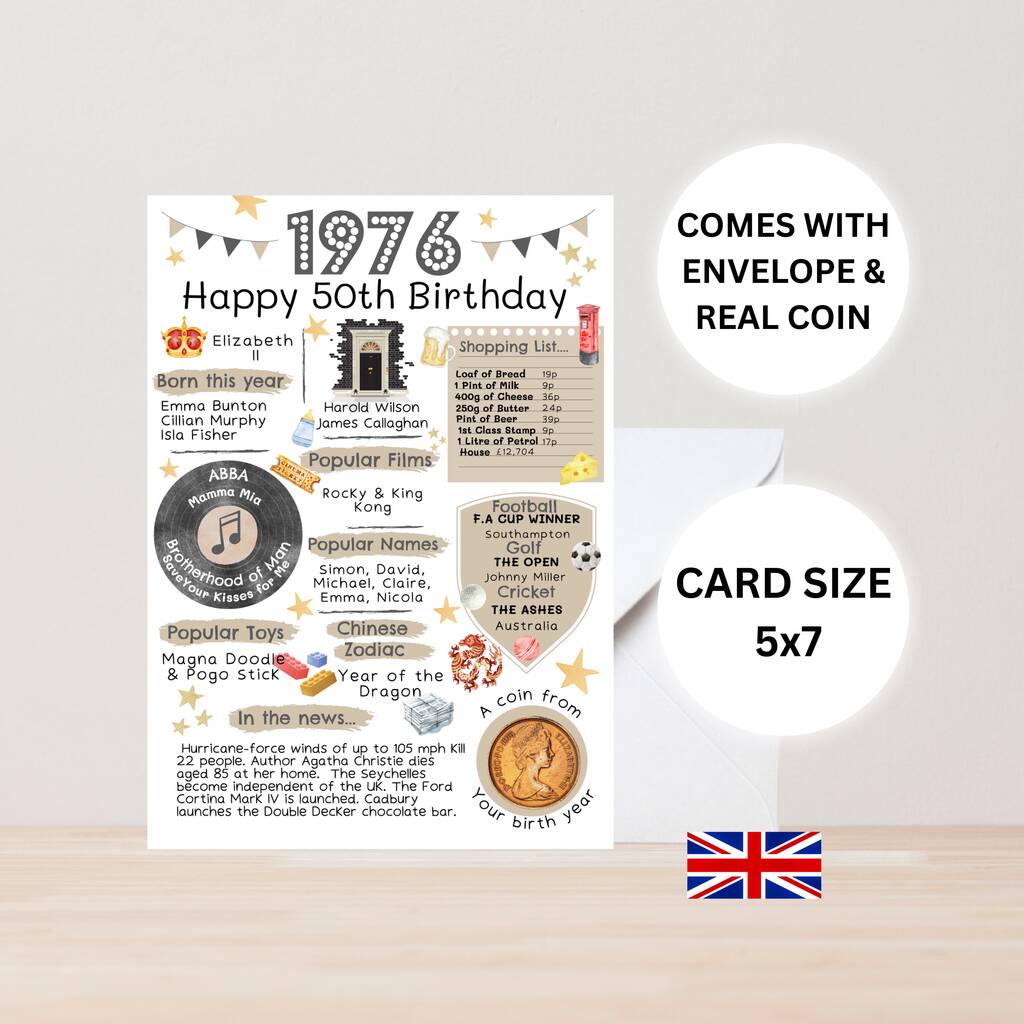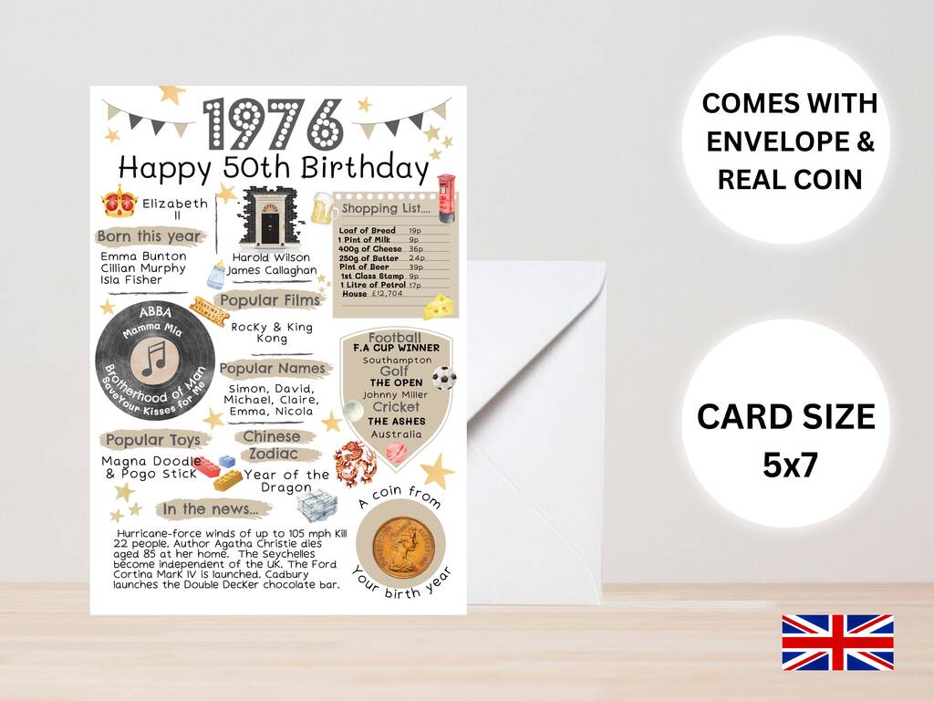 A perfect card to reminisce of 1976 in Britain and look at popular songs, names and films in the year the recipient was born. This nostalgic keepsake card comes with a genuine, circulated 1976 dated coin which is polished and attached to the card. The type of coin may change from the one in the listing photo depending on stock. Cards are placed in a cello bag and are sent in a hard-backed 'Do Not Bend' envelope for protection