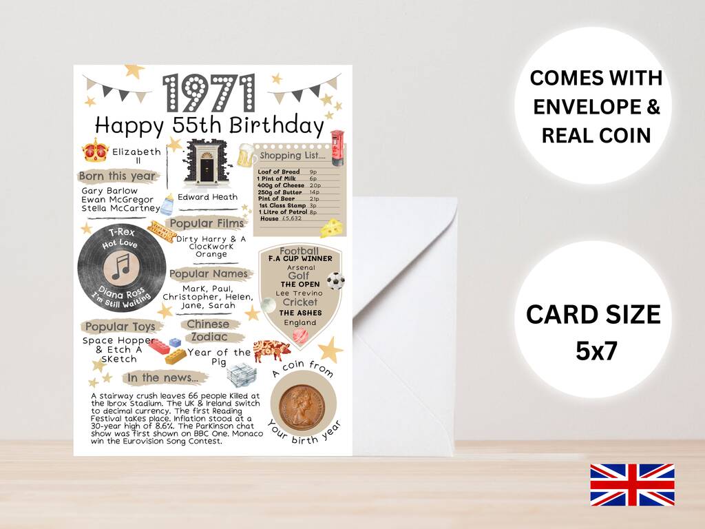 55th Birthday Card With 1971 Coin And Envelope Choose Your Colour