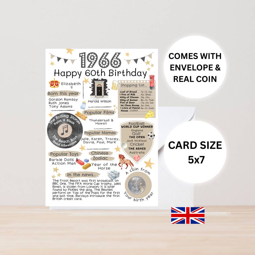 A perfect card to reminisce of 1966 in Britain and look at popular songs, names and films in the year the recipient was born. This nostalgic keepsake card comes with a genuine, circulated 1966 dated coin which is polished and attached to the card. The type of coin may change from the one in the listing photo depending on stock. Cards are placed in a cello bag and are sent in a hard-backed 'Do Not Bend' envelope for protection