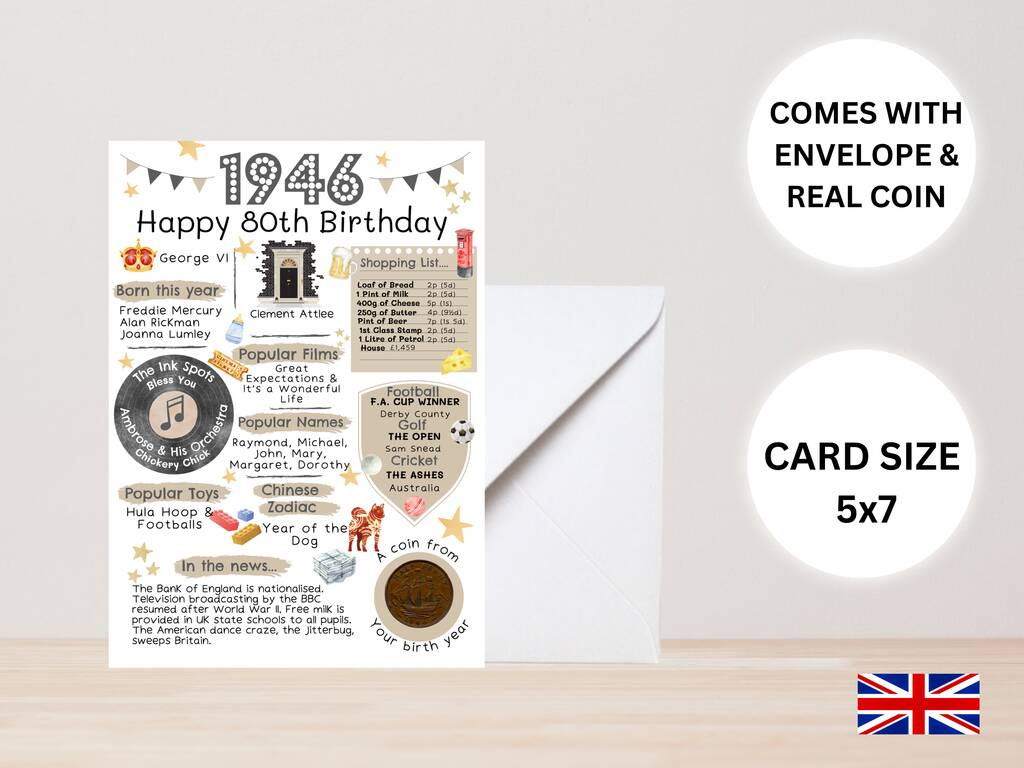80th Birthday Card With 1946 Coin And Envelope Choose Your Colour