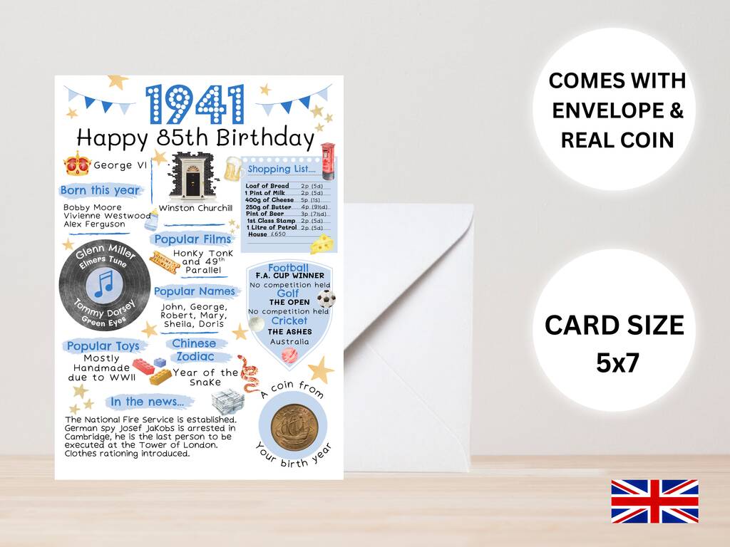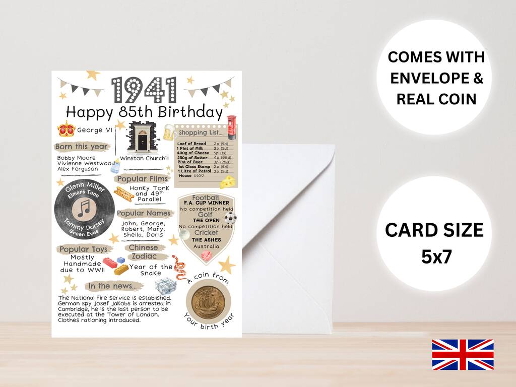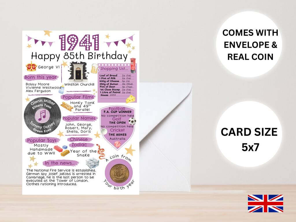 85th Birthday Card With 1941 Coin And Envelope Choose Your Colour