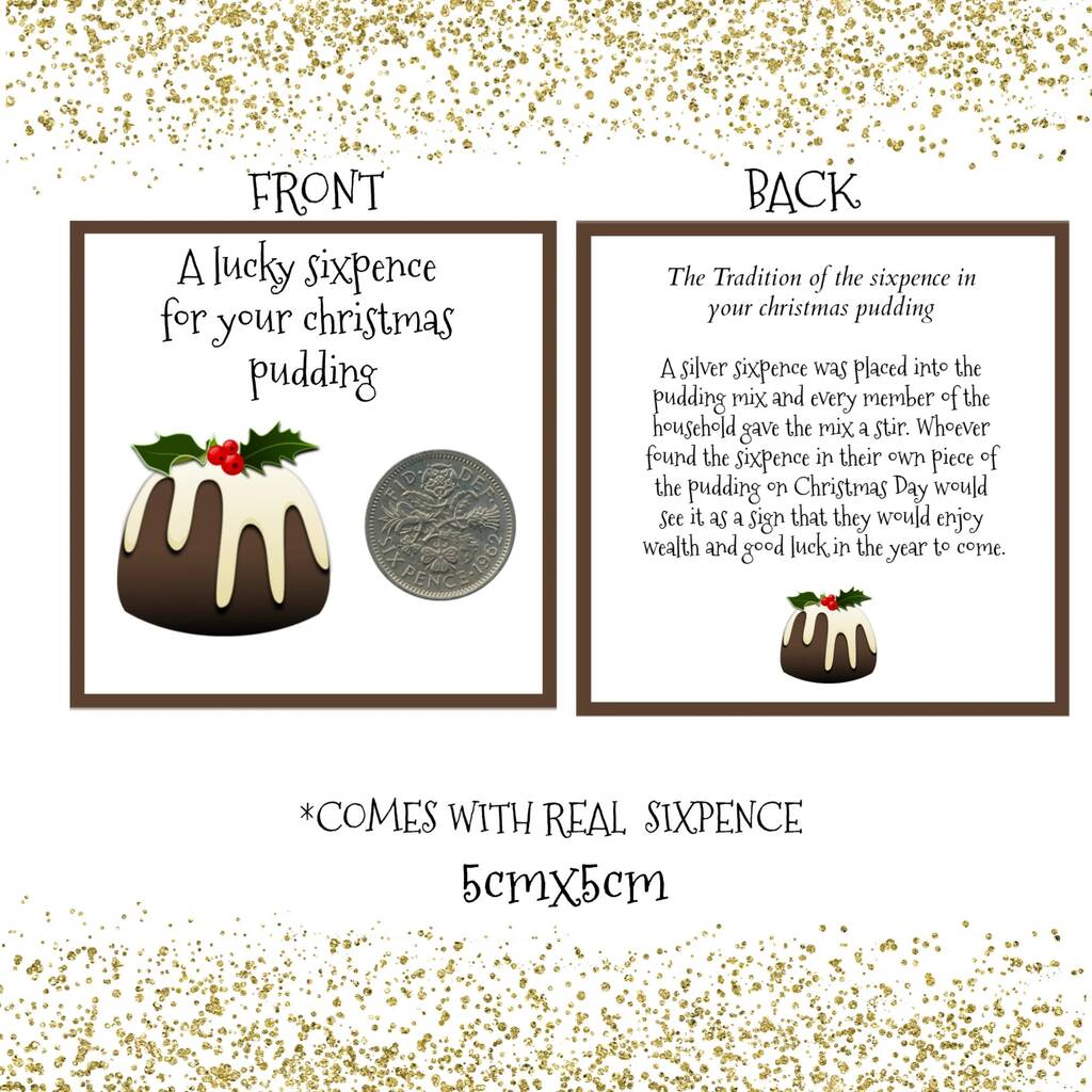 Comes complete with a genuine sixpence which is ex circulated but has been cleaned for a lovely finish (date is random from 1947-1967). It is then mounted onto white card on the reverse the verse reads the tradition of the sixpence at xmas time for your pudding