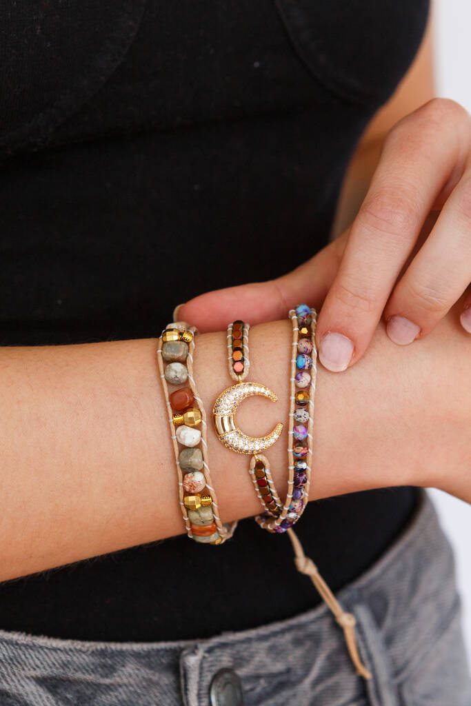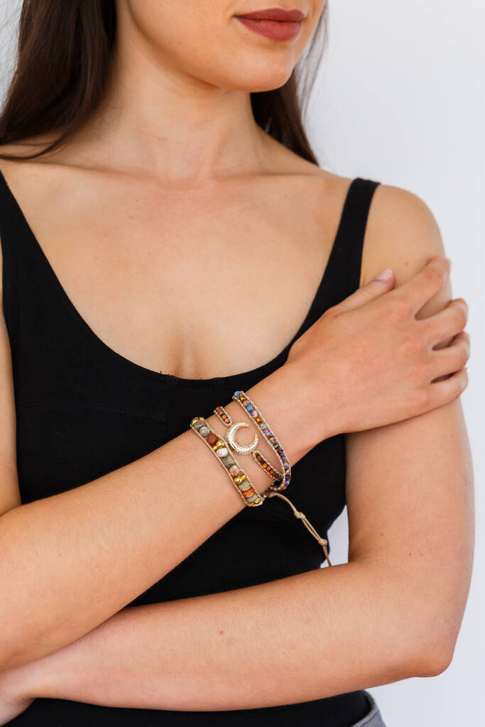 Our jasper bracelet holds a central heart encased in gold plated metal, whilst the smaller jasper stones and gems are weaved together off a soft leather cord.