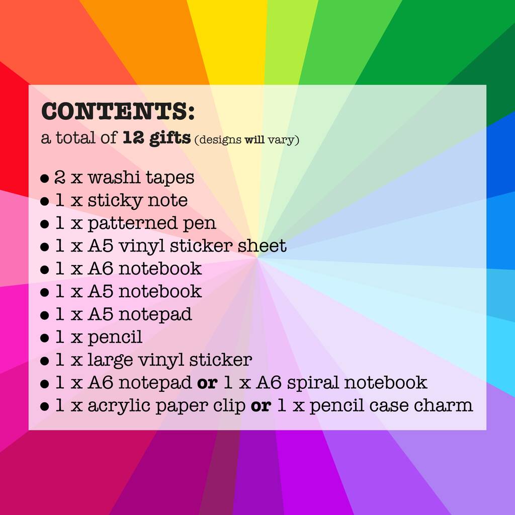 2 x washi tapes, 1 x sticky note, 1 x patterned pen, 1 x A5 vinyl sticker sheet, 1 x A6 notebook, 1 x A5 notebook, 1 x A5 notepad, 1 x pencil, 1 x large vinyl sticker, 1 x A6 notepad OR 1 x A6 spiral notebook, 1 x acrylic paper clip OR 1 x pencil case charm