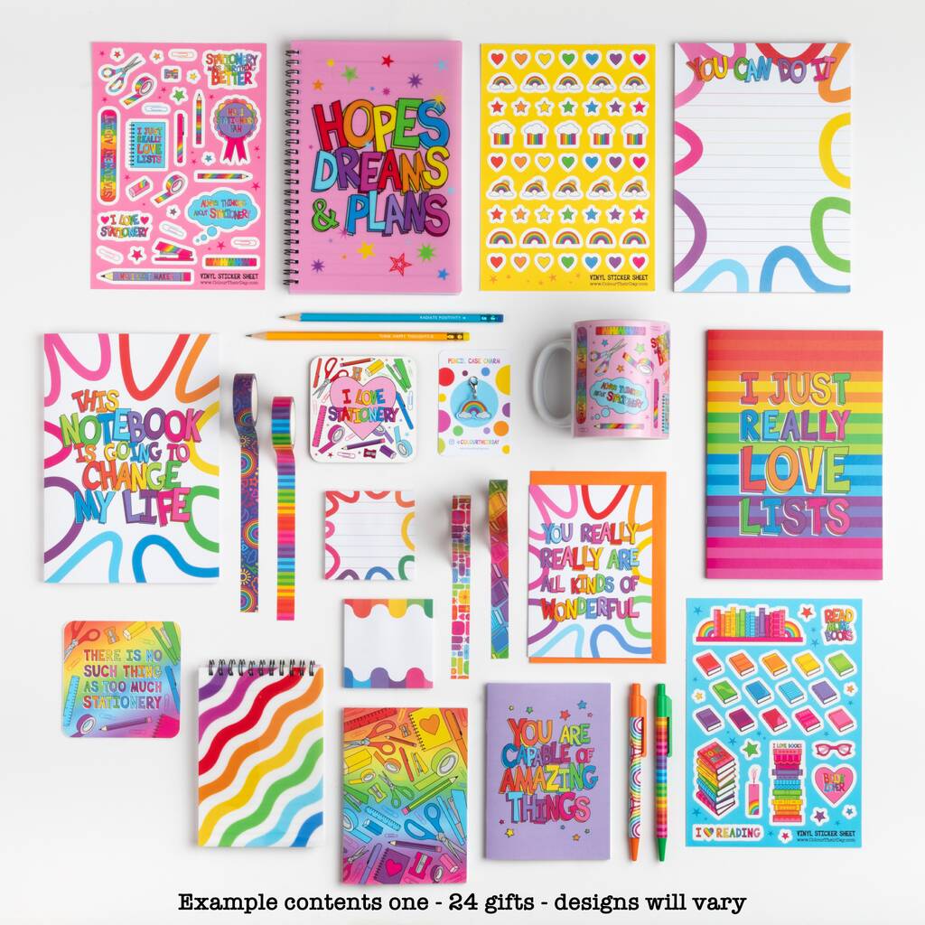 Inside there are 24 STATIONERY gifts - such as washi tapes, stickers, pens, pencils, sticky notes, notebooks, notepads and a “stationery-themed” item or two! Designs will vary and the combination of products will also vary a little bit - this is all detailed below in the full contents list (with possible variations). Please also see the images, which show three sets of example contents. Please note: the Christmas washi tape will be substituted for a different design.