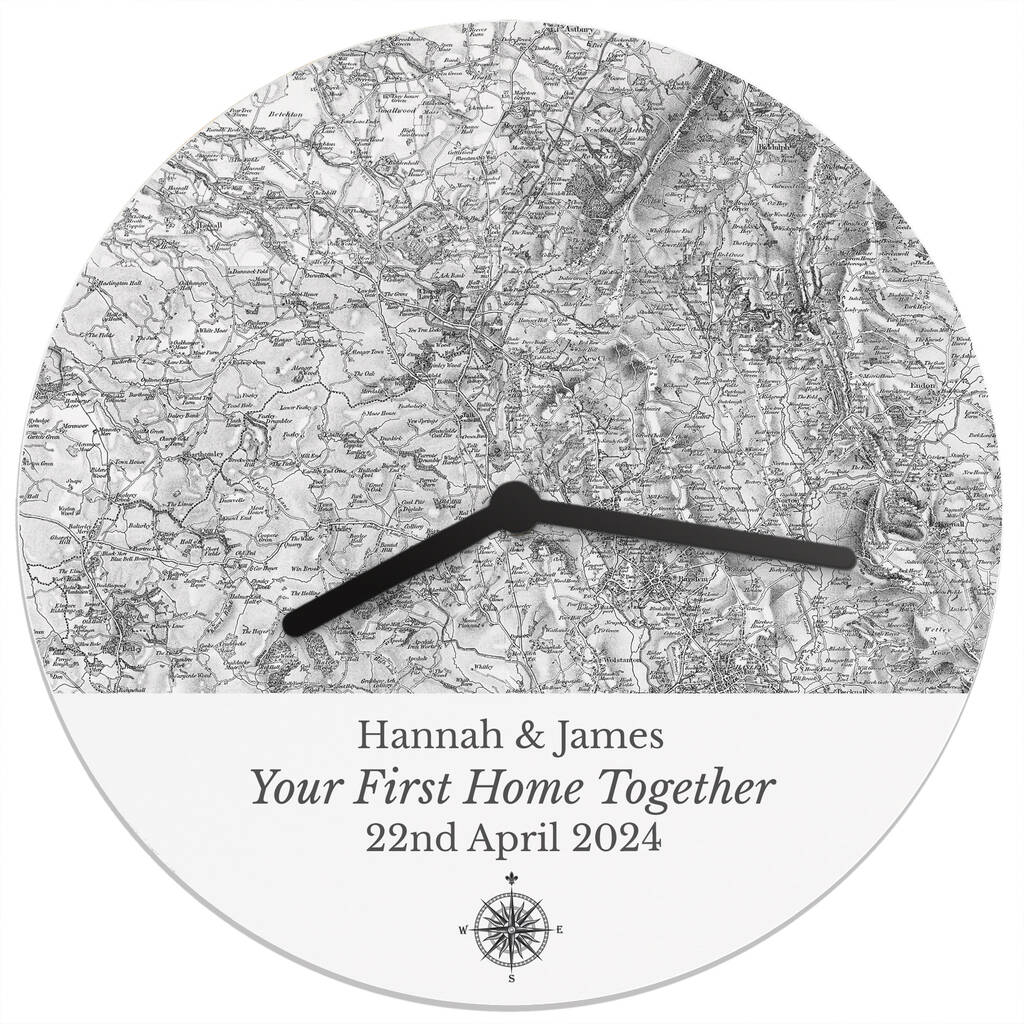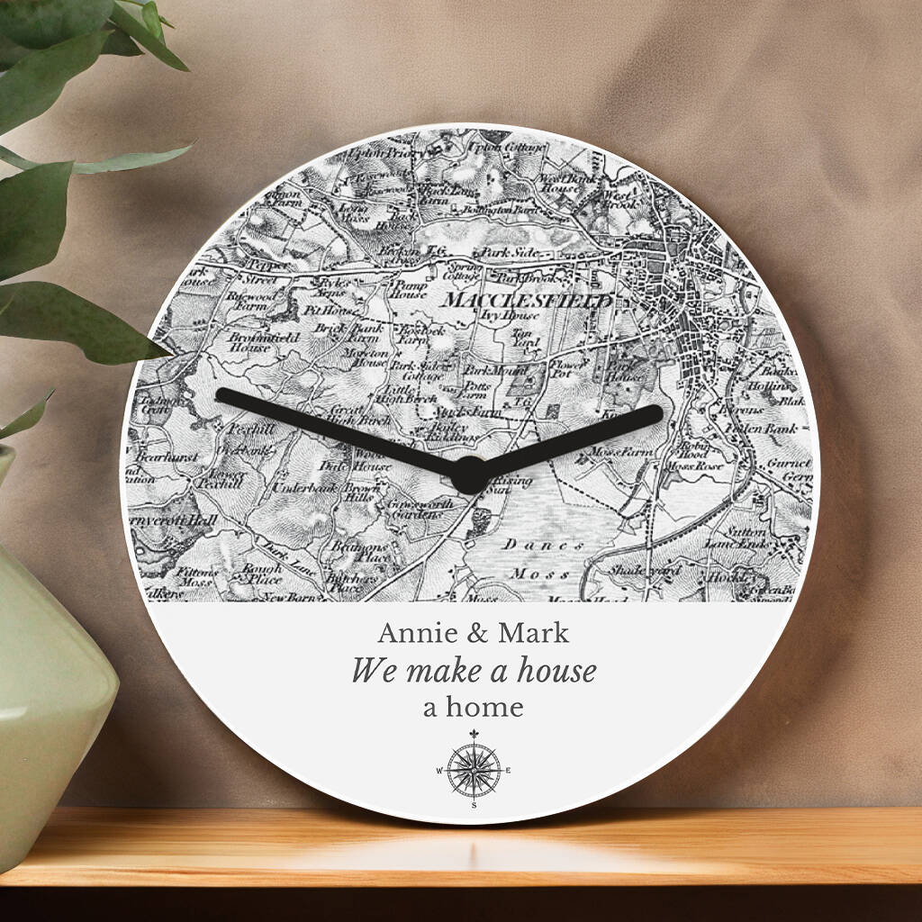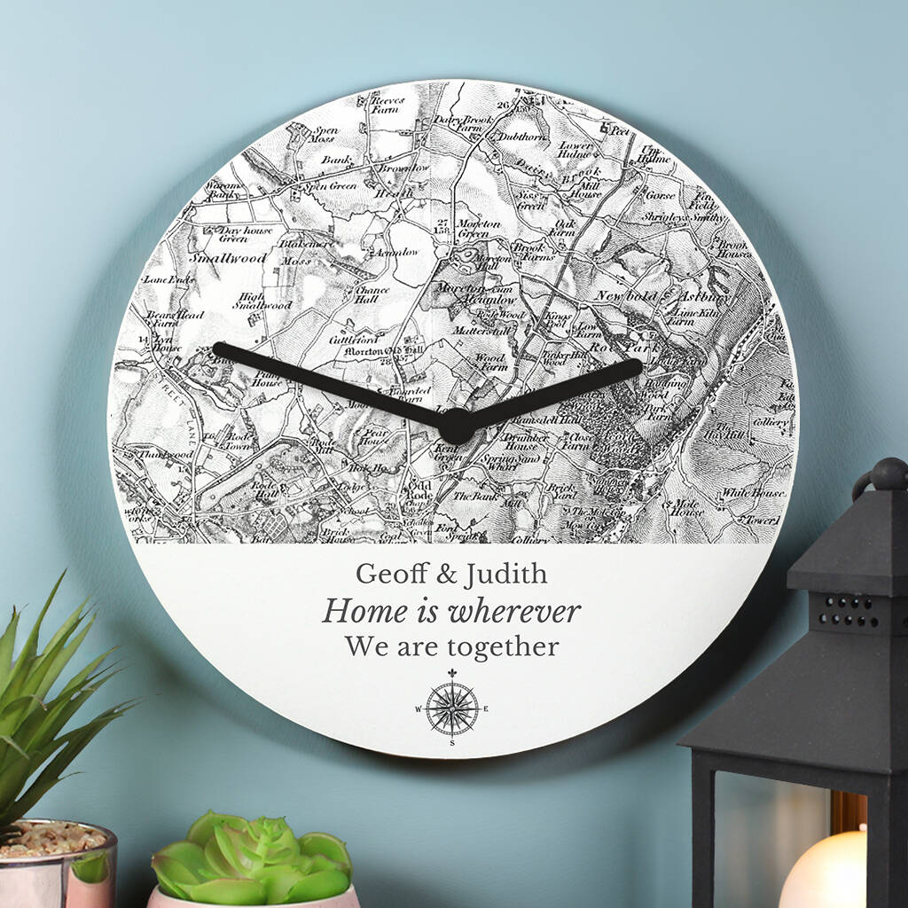 A wooden wall clock personalised with a full UK postcode and three lines of wording. Featuring a classic map design, it suits hallways, kitchens and living rooms. Requires 1 x AA battery (not included). A distinctive piece of home décor and a thoughtful gift for new homes and anniversaries. Thoughtfully finished, it’s designed to be cherished and enjoyed for years to come.Personalise this Old Series 1805 - 1874 Clock with a Full UK postcode of your choice. We can then personalise up to 3 lines, 25 characters per line.Please note line 2 will be in larger writing than lines 1 and 3.All personalisation will appear as requested.Battery not included, requires 1 AA battery.Material is WoodScale is 1:50,000All maps are digital reproductions of original Ordnance Survey maps.Copyright Cassini Publishing LtdPLEASE NOTE - Please ensure when entering your postcode that it is a valid postcode. If the postcode is incorrect it will delay your order. The Map used for the preview is for illustrative purposes only and not a representation of the postcode entered.Maps are not available for Northern Ireland, The Channel Islands or the Isle of Man (any postcodes starting with BT, GY, JE or IM).