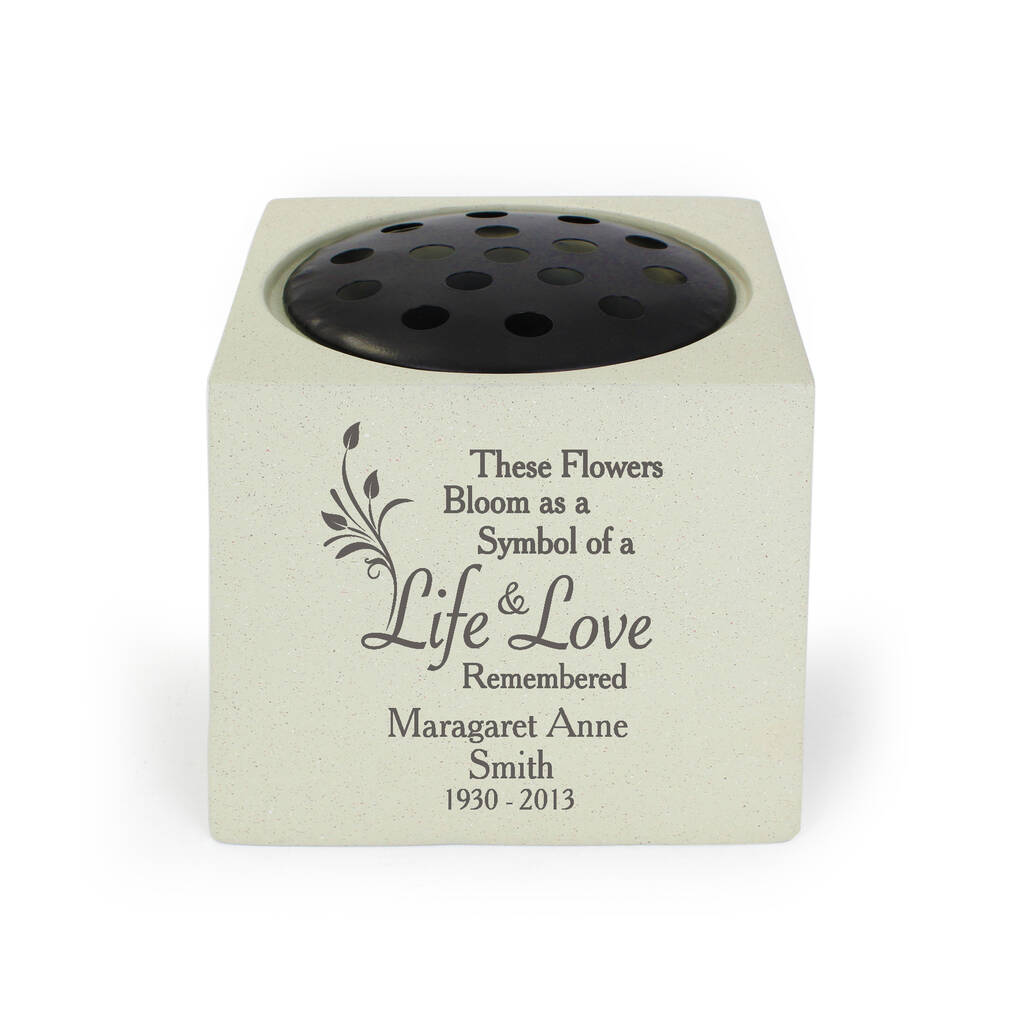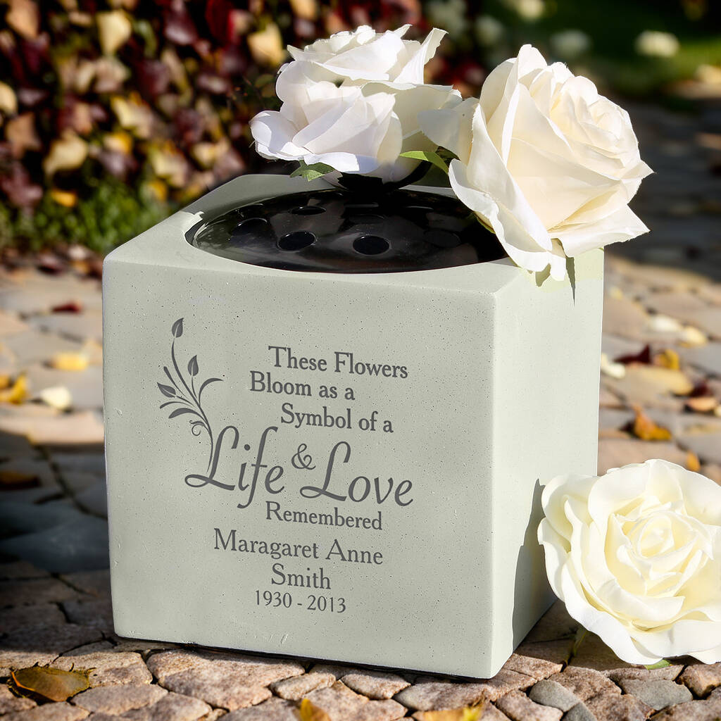 This memorial vase offers a dignified way to pay tribute, complete with personalised lines for names, dates or messages. Crafted from sturdy resin, natural variations may occur and add character. Designed to hold flowers in remembrance gardens or quiet spaces, it creates a meaningful focal point for reflection. For best readability, please avoid using all capitals, as the font style works best with mixed case personalisation.PLEASE NOTE Due to the natural materials used (Resin) there may be some natural imperfections in the product, this may result in blemishes appearing on the area of personalisation.NOTE: Due to the font type used please refrain from using all capitals in your personalised message. If the message is all in capitals you will find the personalisation extremely difficult to understand and may even result in personalisation being missed off the product. Many thanks for your cooperation.David - AcceptableDAVID - Not AcceptableA perfect way to remember a loved one.