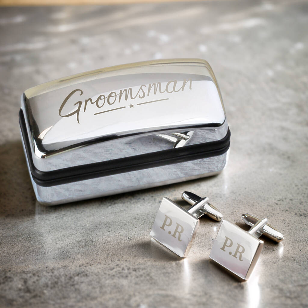 Elegant engraved cufflink sets for every key role in your wedding party.Celebrate your big day with these beautifully personalised wedding cufflink sets, crafted for each special member of your wedding party. Each pair is presented in a sleek chrome-effect box engraved with their role—Best Man, Groom, Groomsman, Usher, Father of the Bride or Groom—and the cufflinks can be personalised with initials. Made from rhodium-plated stainless steel and lined with soft flock fabric, each set is a meaningful keepsake to mark their important part in your celebration.