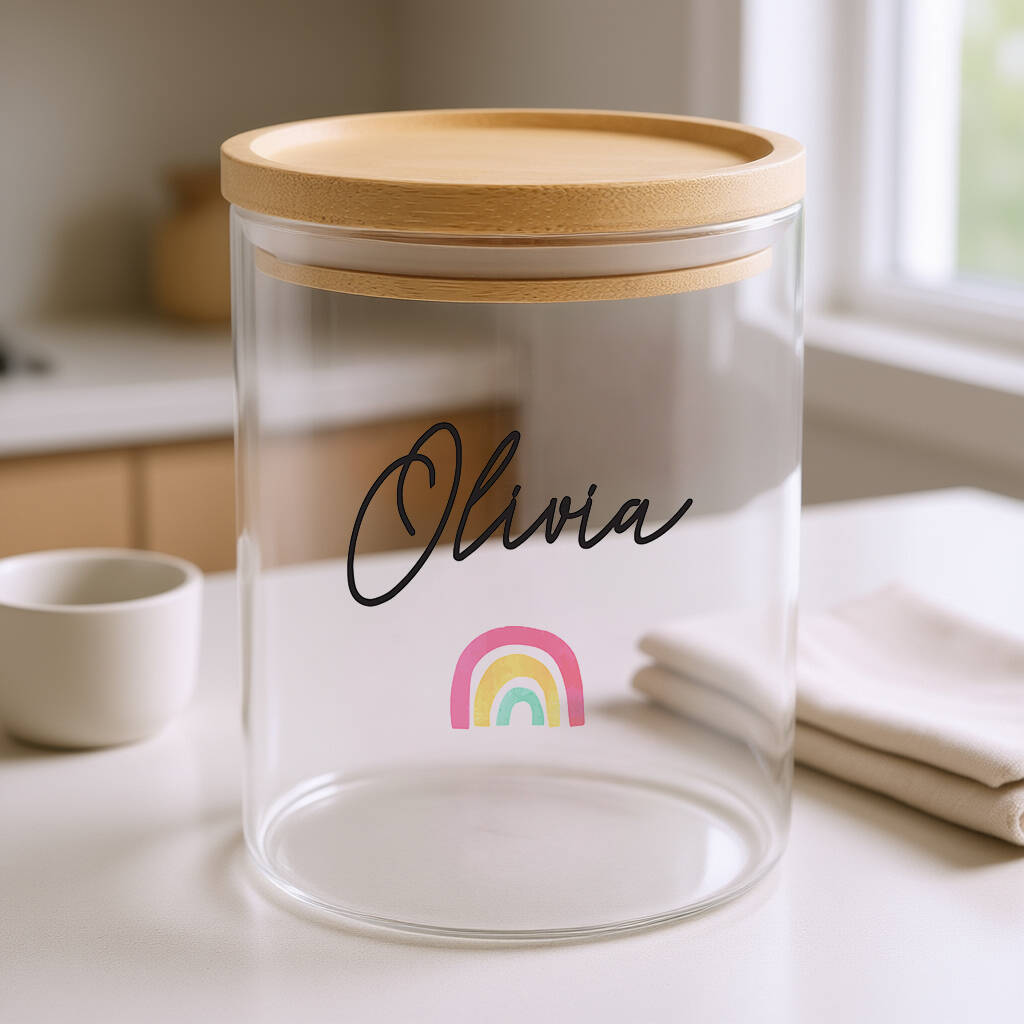 Rainbow Personalised Glass Storage Jar Bamboo Lid