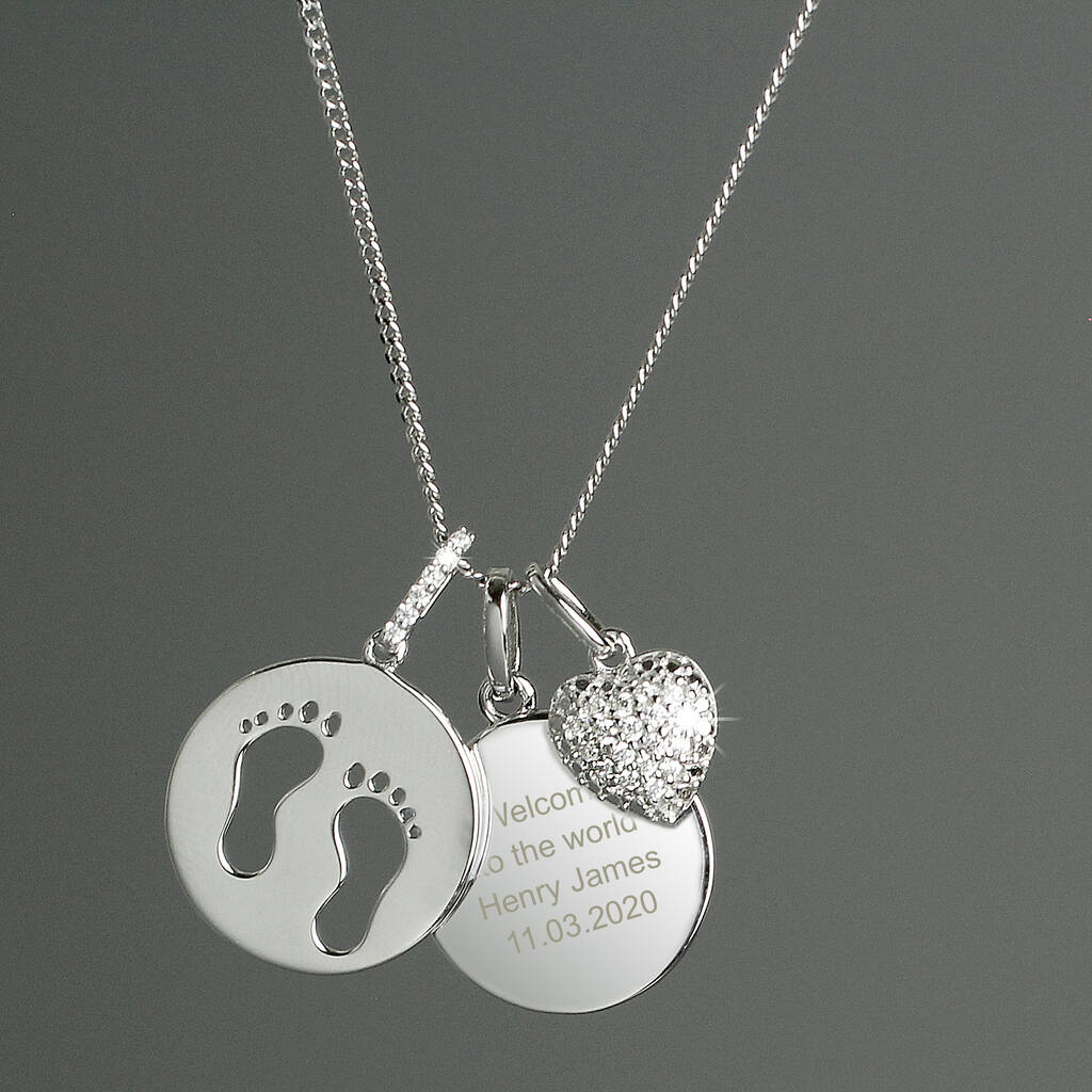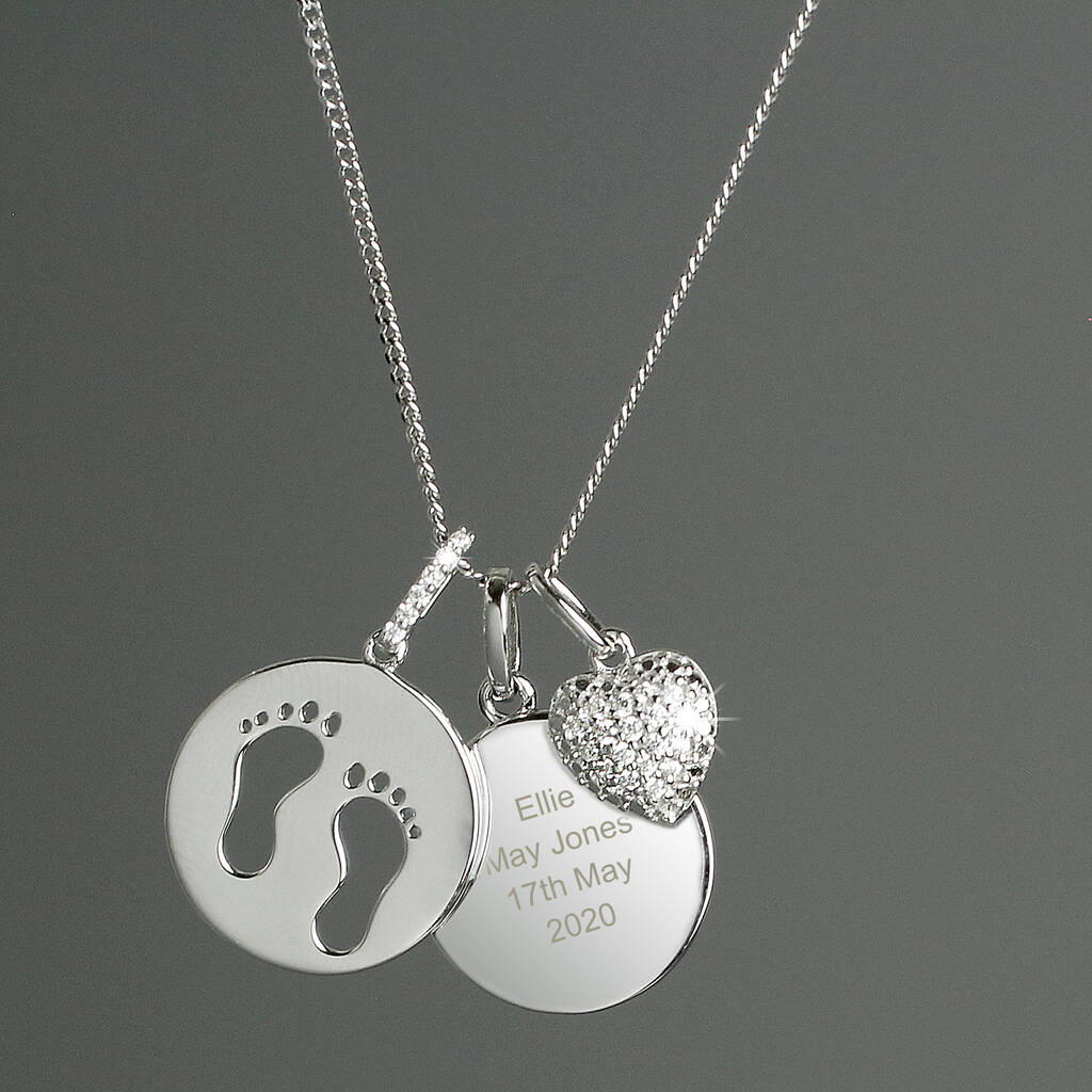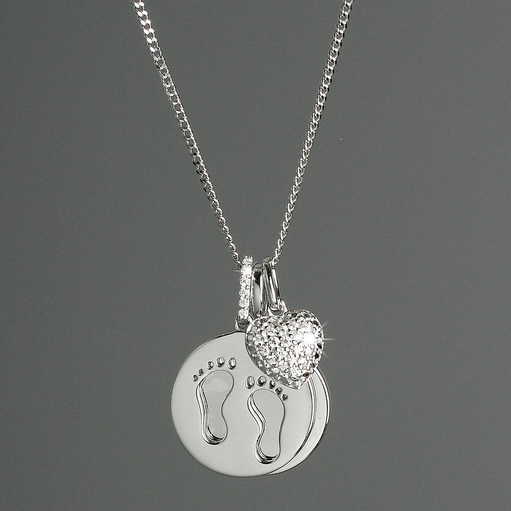 Silver Footprints And Zirconia Heart Necklace