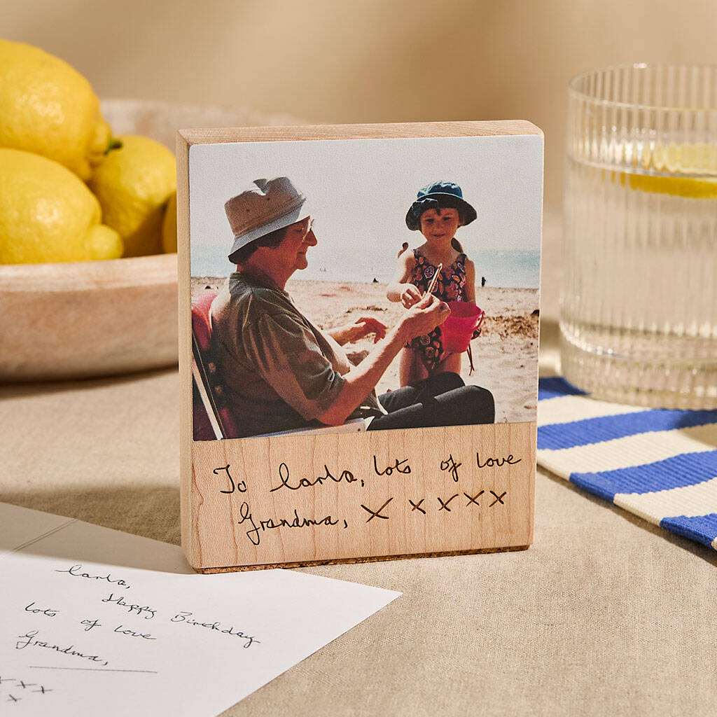 There’s something deeply personal and unique about a person’s handwriting which makes old cards and letters they’ve written so treasured. Our wooden photo blocks can be engraved with an exact copy of words from their hand, alongside their photograph, creating a reminder of them to cherish every day in your home or office.