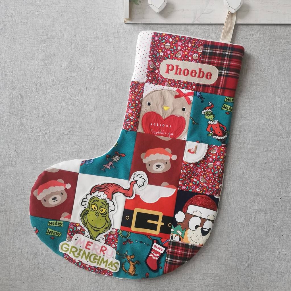 Your child's clothing is all lovingly sewn together in a process where each square is fussy cut from the clothes, fused to a layer of luxury interfacing to stabilize and prolong the life of your stocking, each square is then pressed and joined to create this beautiful and unique patchwork Christmas stocking, with all your treasured baby clothes.